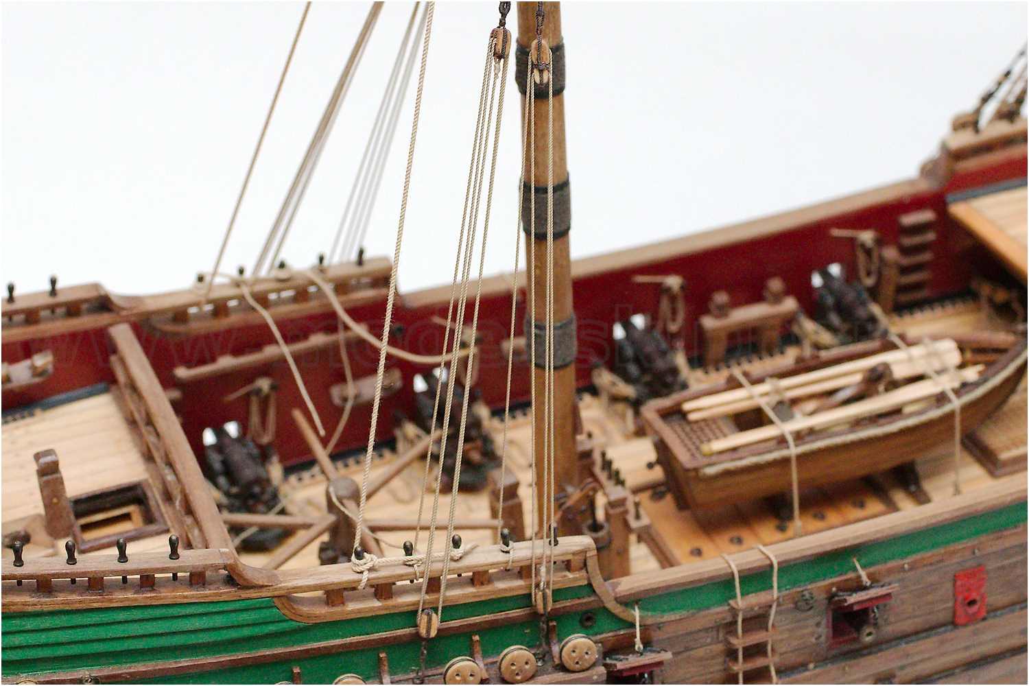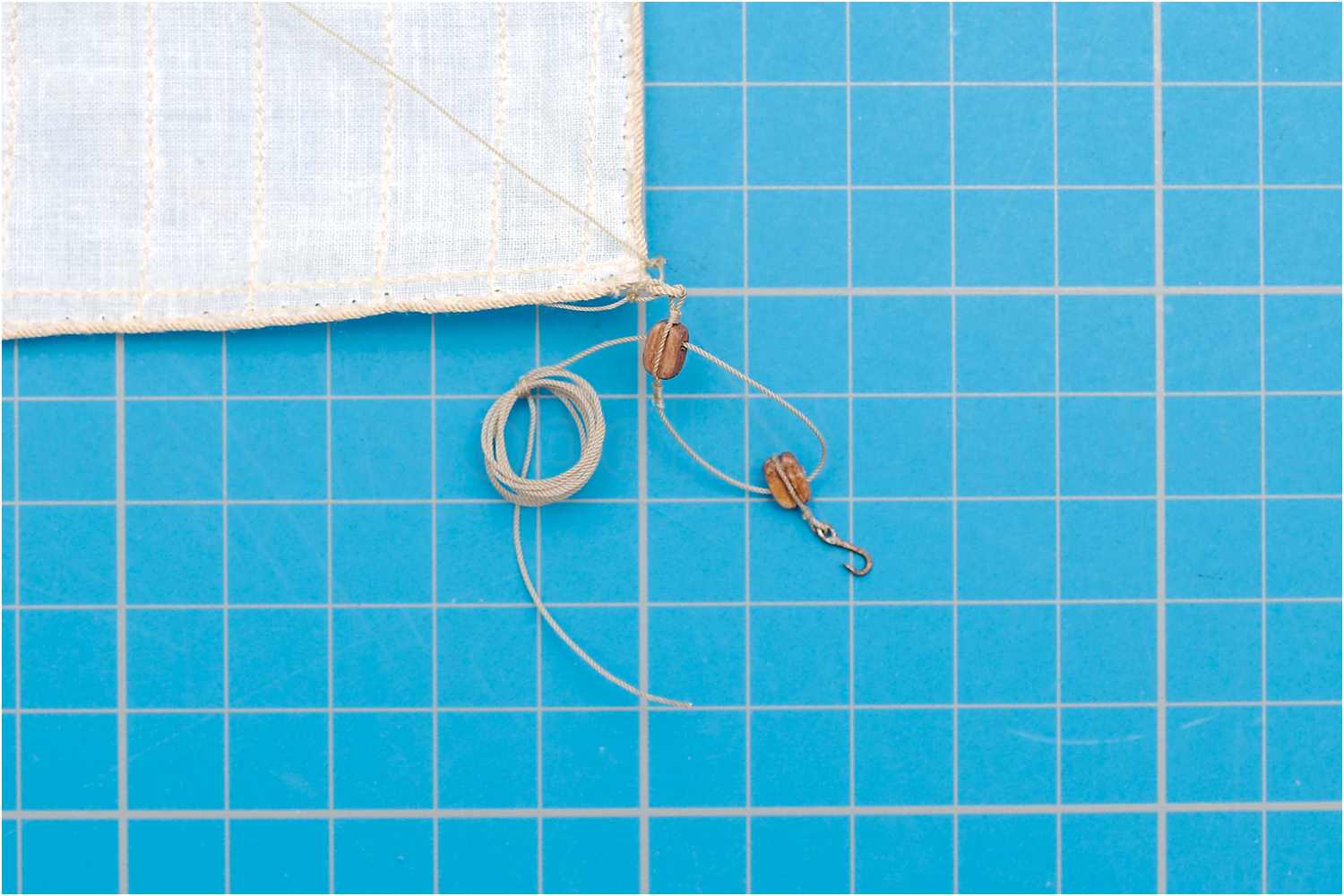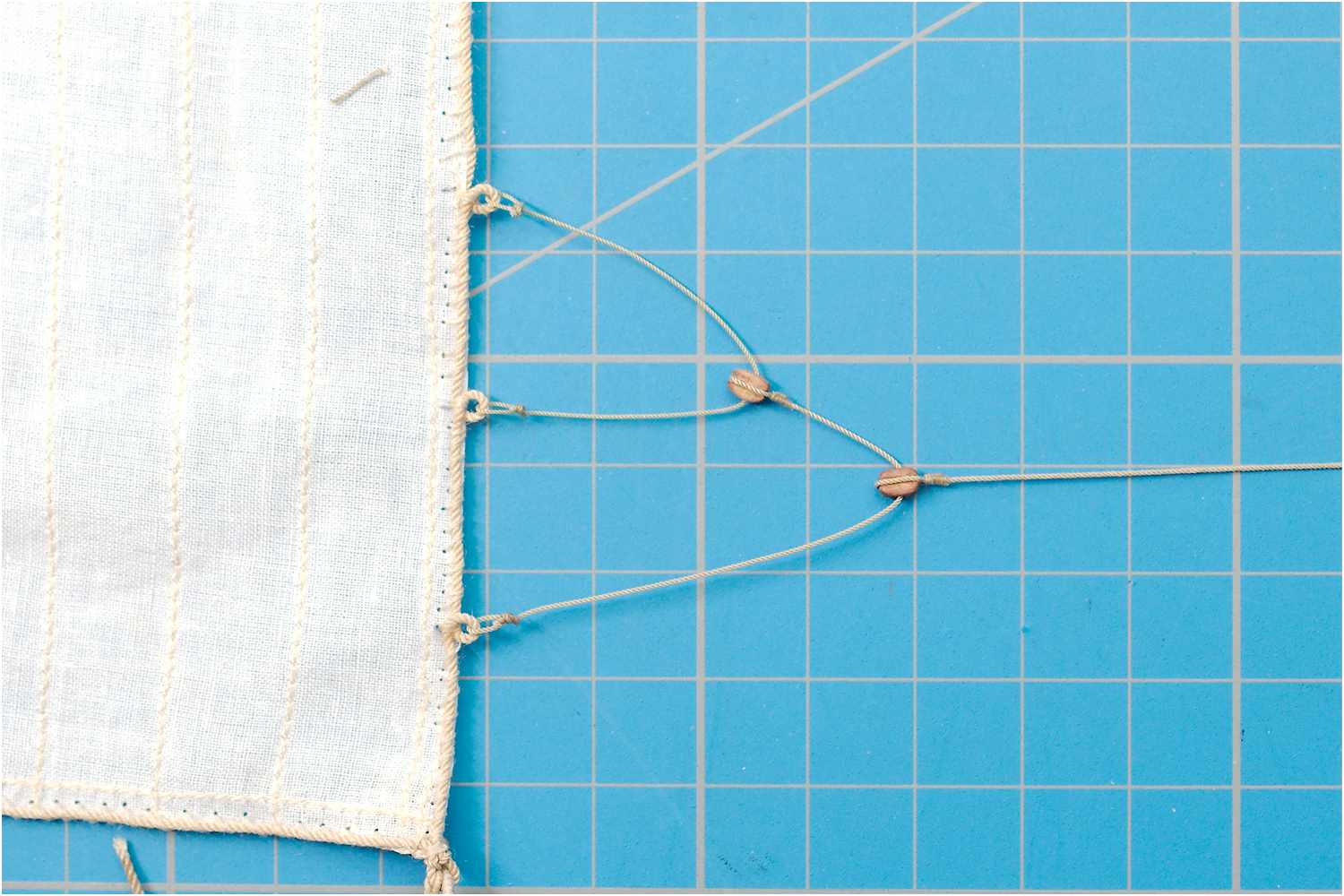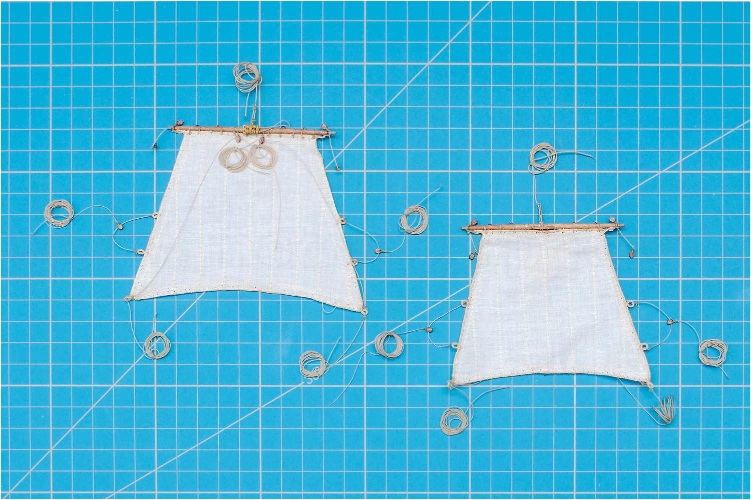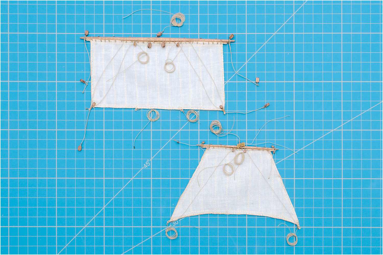 Für das laufende Gut nutze ich Garn der Fa. Gütermann vom Typ Mara, Skala oder Tera mit den unterschiedlichsten Fadenstärken von 30 bis 420, um entsprechend flexibel die notwendigen Taudurchmesser schlagen zu können. Ein Übersicht der Taue, die mit diesen Garnen geschlagen werden können, findet man hier.