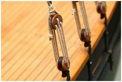 Die bekleideten Wanten sind gut zu erkennen und passen prima ins Ambiente. Das Tau für das Taljereep habe ich wieder nach Maß auf meiner Reepmaschine selbst geschlagen.