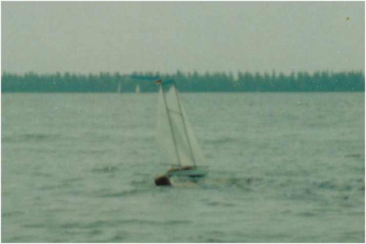 Das Ursache war allerdings selbstverschuldet. Es wurde vergessen, die große Decksluke abzudichten. Eine starke Windböe drückt das Modell komplett auf die Seite. Dabei löst sich der Kajütaufbau und binnen weniger Sekunden lief der Rumpf voll Wasser und versank mit dem Bug voran in den Fluten.
