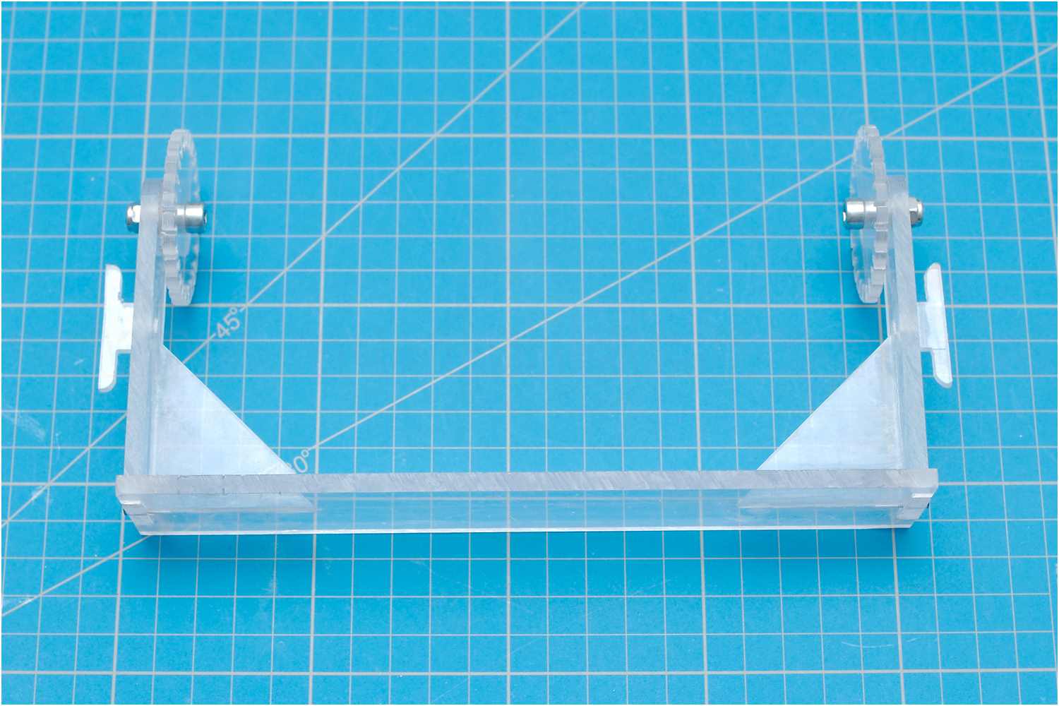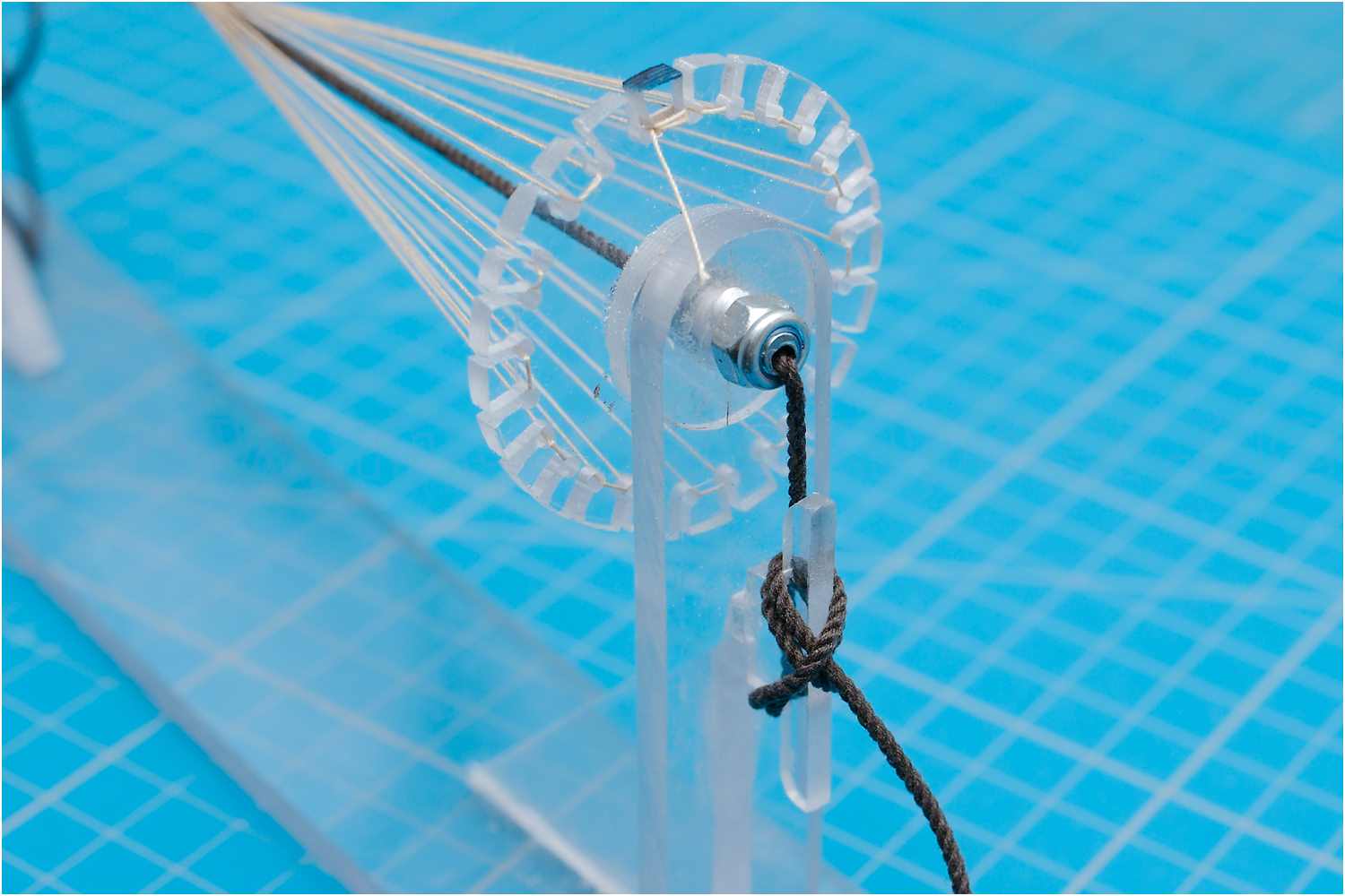 Nach den ersten Versuchen hat sich herausgestellt, dass sich hierbei die seitlichen Stützen durch die Spannung der Fäden verbiegen, sodass ich als Verstärkung noch zwei Plexiglaswinkel angeklebt habe.