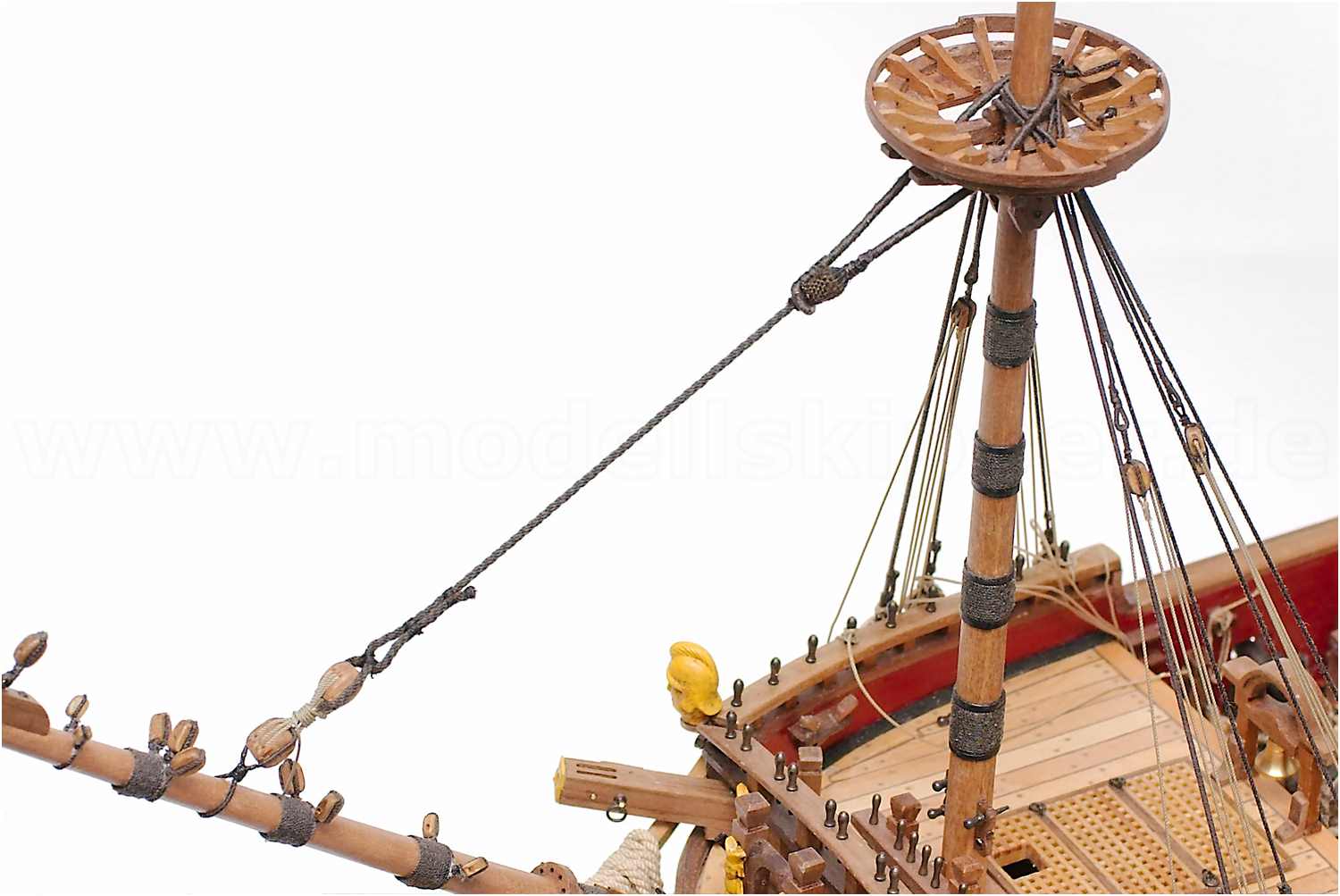 Ein kleines in Form einer Birne geschliffenes und durchbohrtes Rundholz als Grundkörper der späteren Stagmaus verklebe ich auf dem Stag, fädle dieses durch die aufgebohrten Schrauben und belege es an den beiden Klampen.
