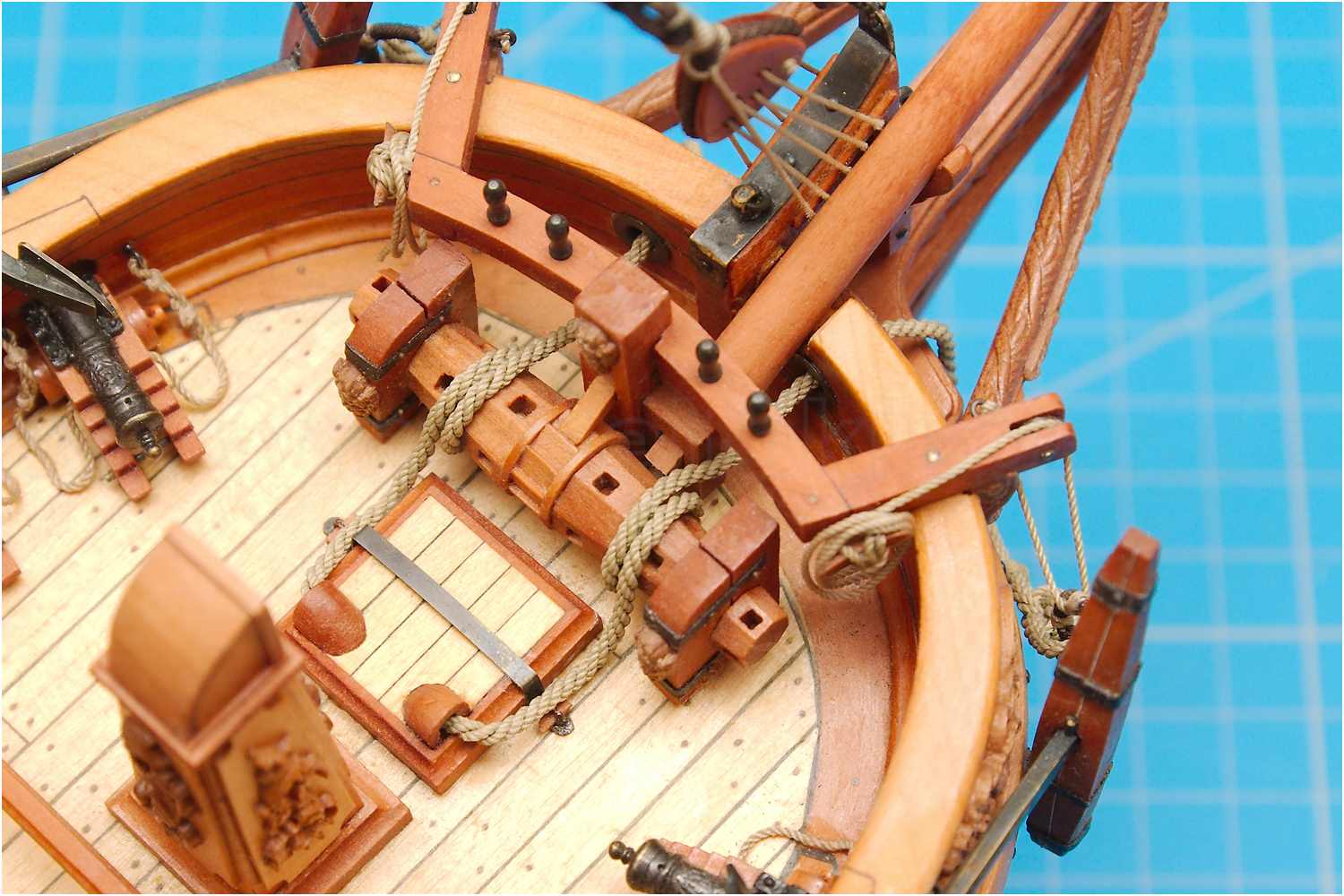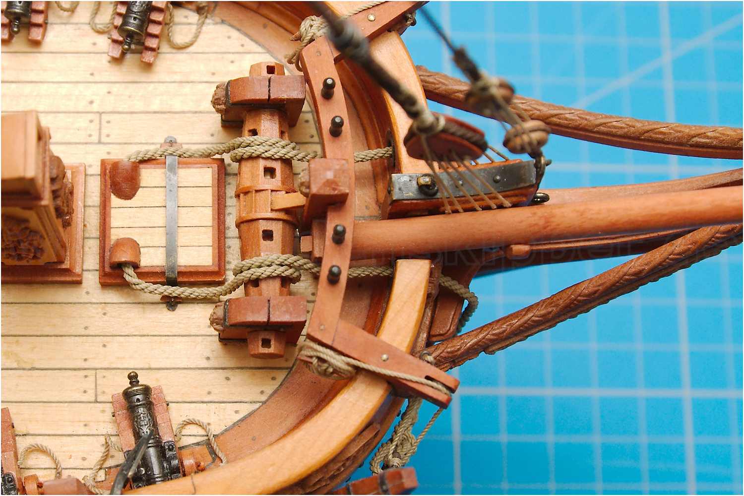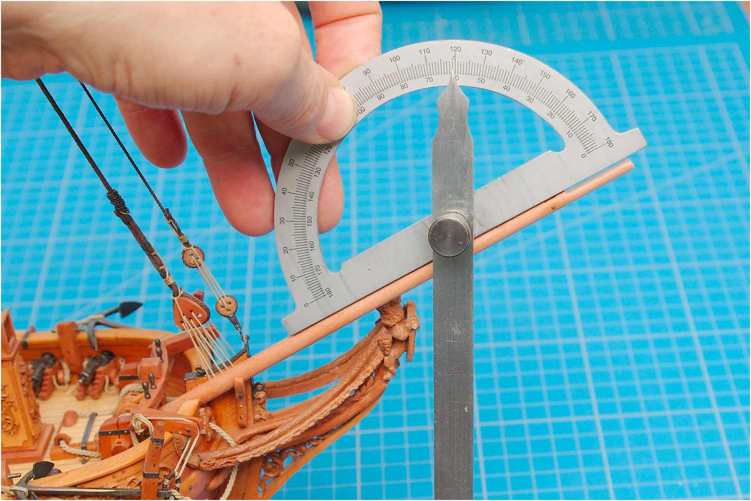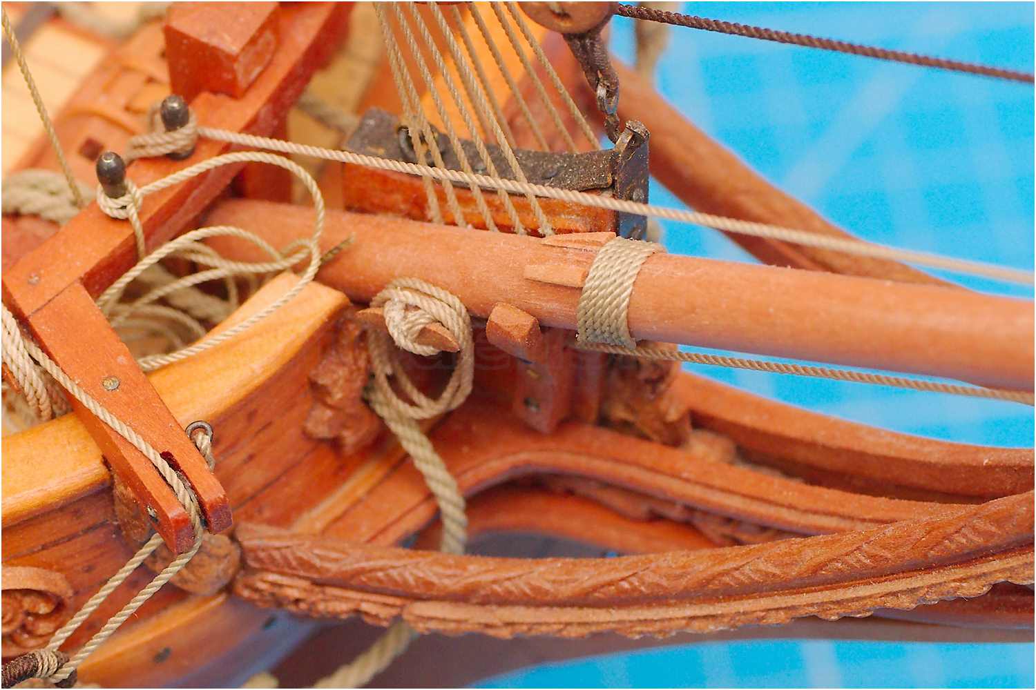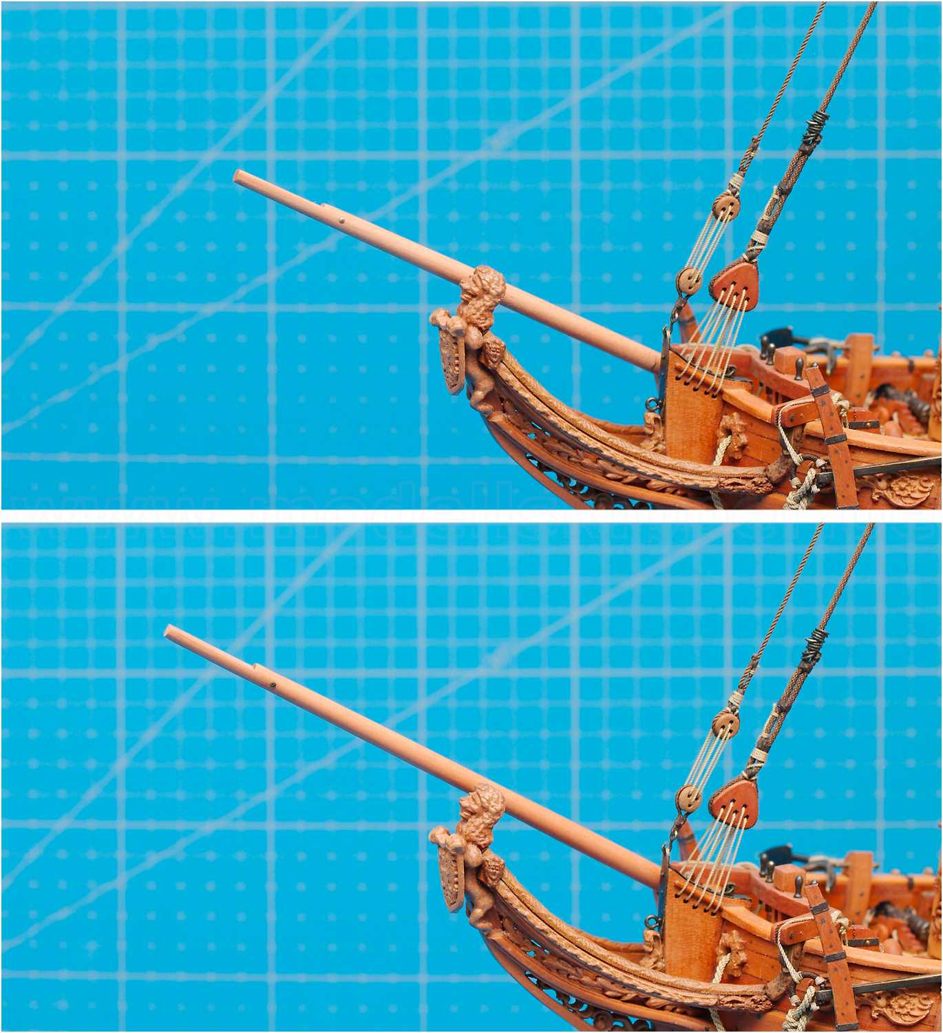 Abschließend wird der Ring mit einem 0,25-mm-Tau bekleidet und testweise auf das Bugspriet gesetzt.
