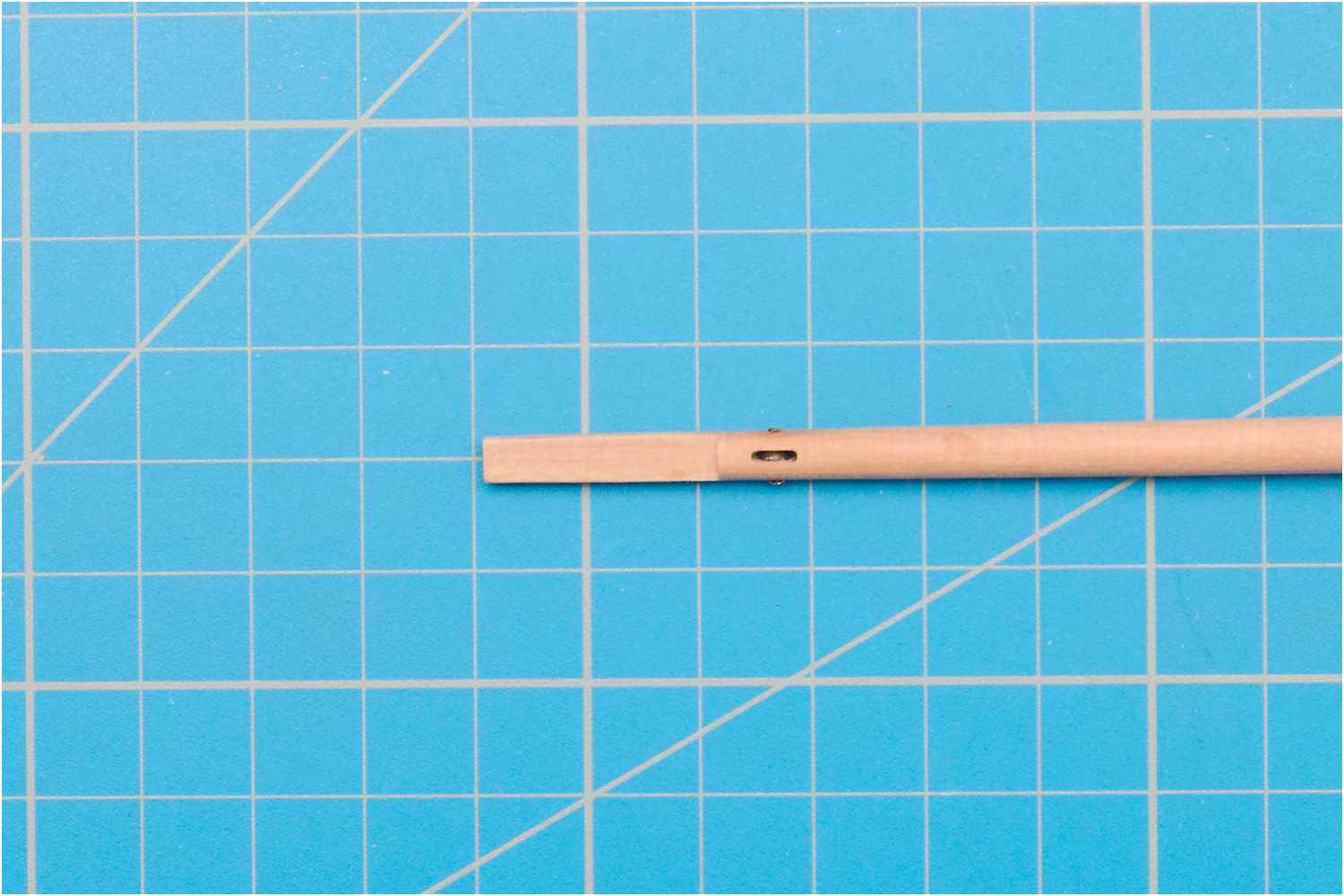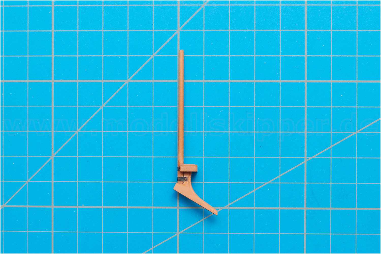 Mit einem Nutbrettchen schleife ich den Göschmast und klebe ihn am Knie fest, die Beschläge imitiere ich mit schwarzer Pappe.