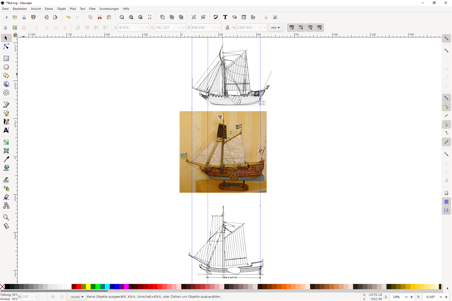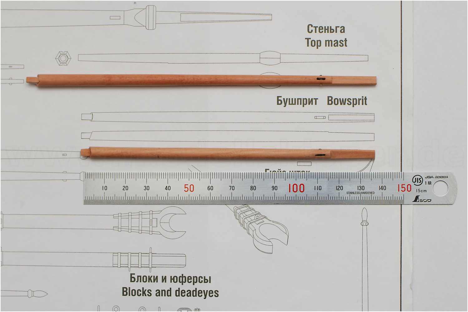 Ich habe mir ein anderes Modell und eine weitere Planzeichnung aus NJ eingescannt, in Inkscape auf den Plan meines Modells skaliert und dann entschiedenen, mein Spriet um etwa 2 cm zu verlängern und 1 mm dicker zu realisieren.