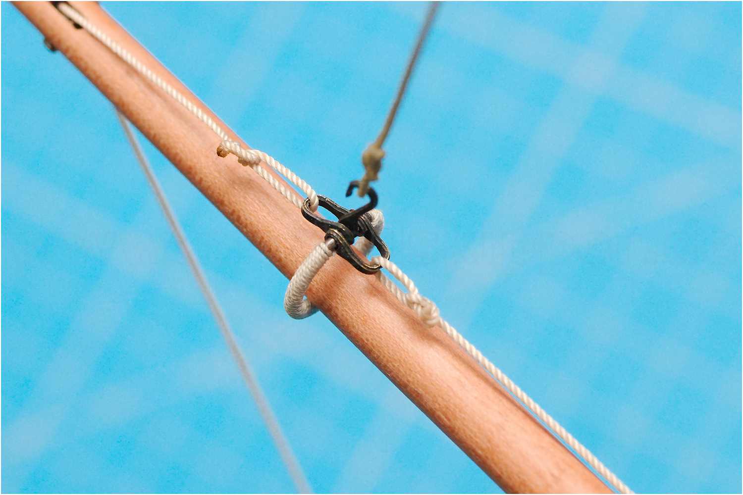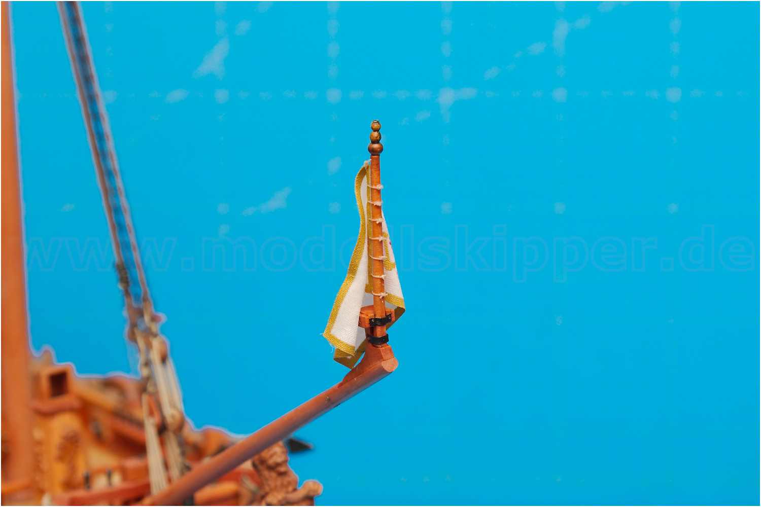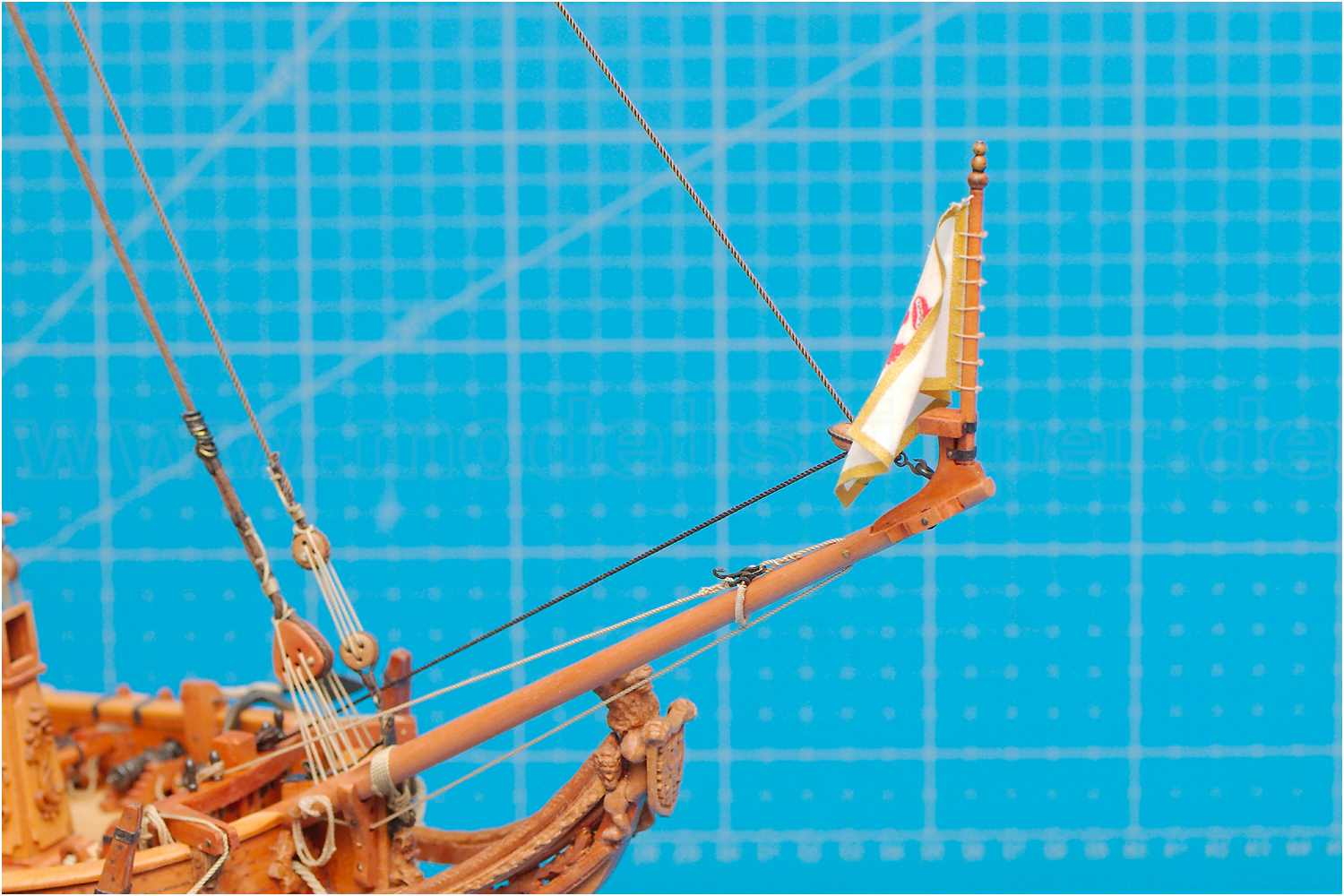Am Vorliek der Gösch fixiere ein Verstärkungsseil mit Sekundenkleber und binde die Flagge mit einzelnen Bändsel an den Göschmast.