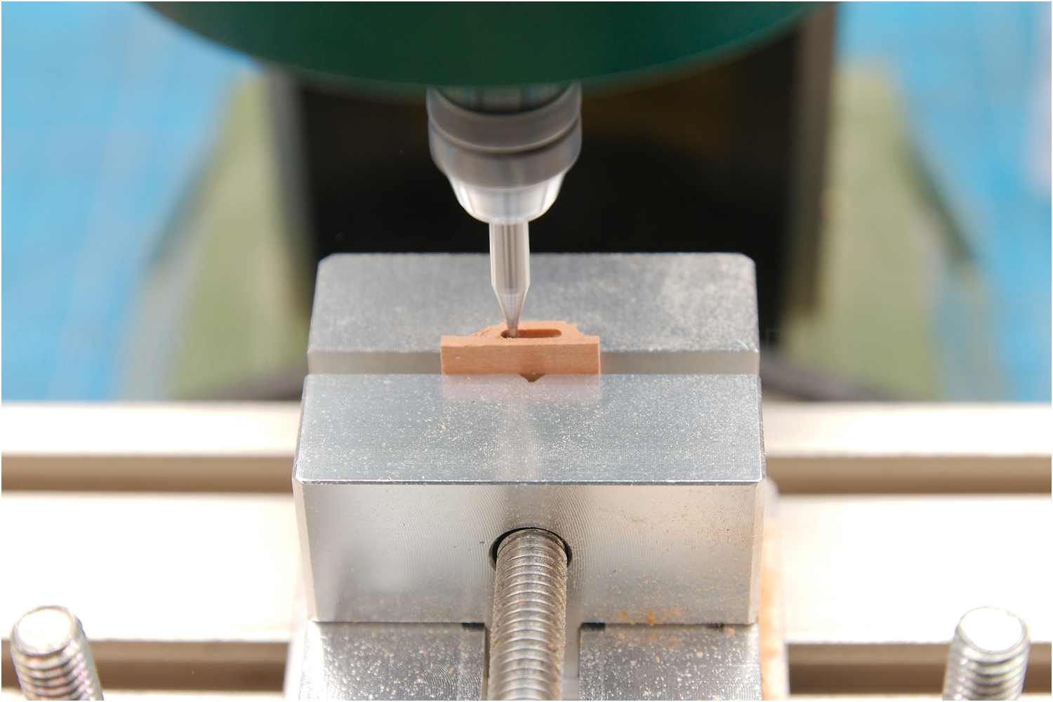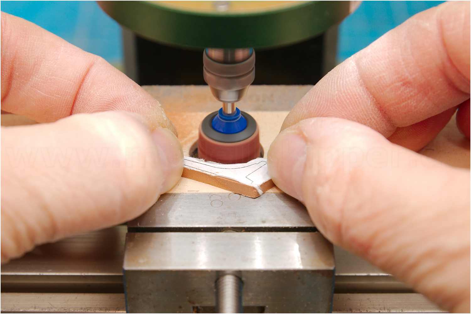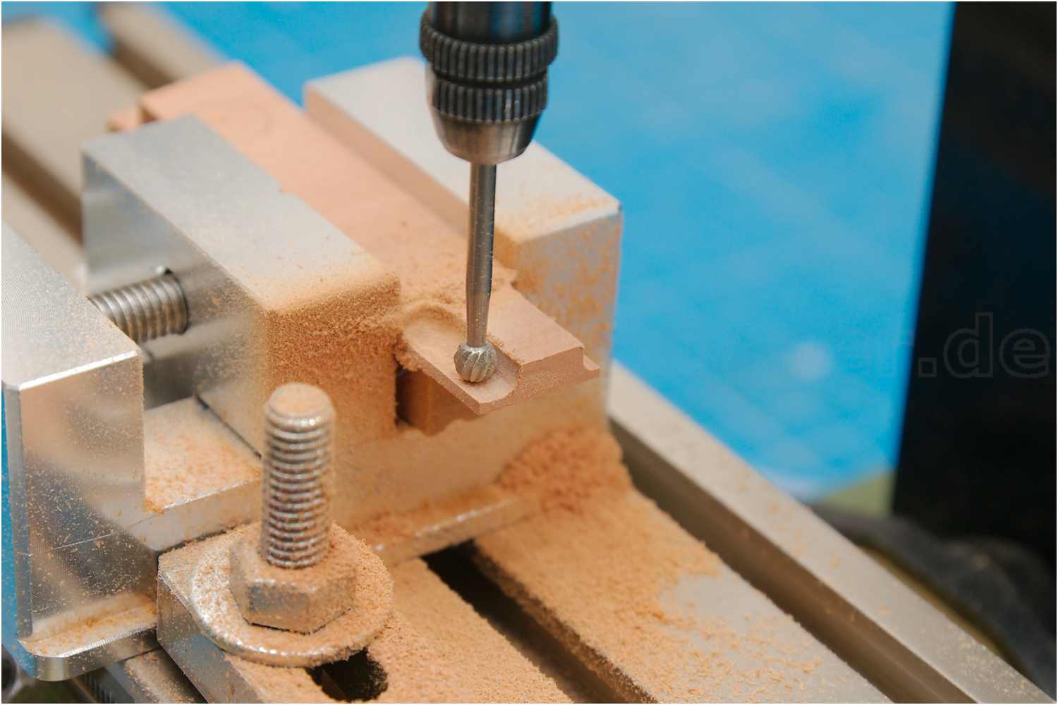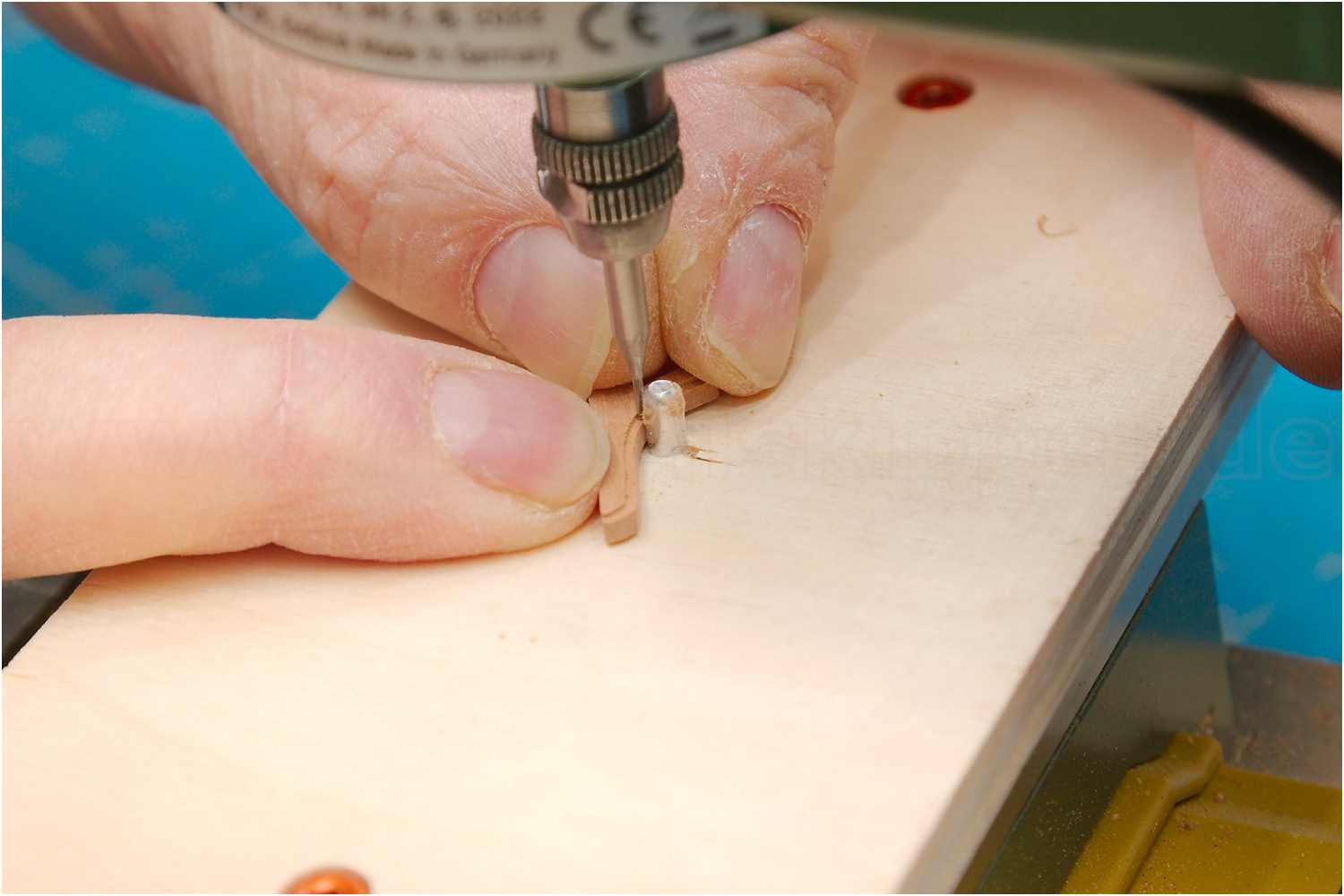 Für das Flaggenknie auf dem Bugspriettopp drucke ich mir eine Schleifschablone aus und fräse den Bogen mit einem Rundschleifkörper.