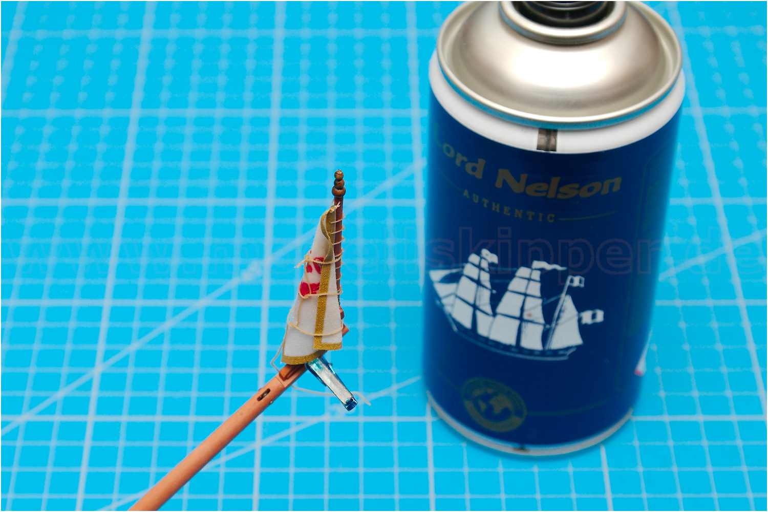 Abschließend wurde die Flagge mit mattem Sprühlack gestärkt, um am Mast hängend eine möglichst natürlichen Faltenwurf zu erhalten.