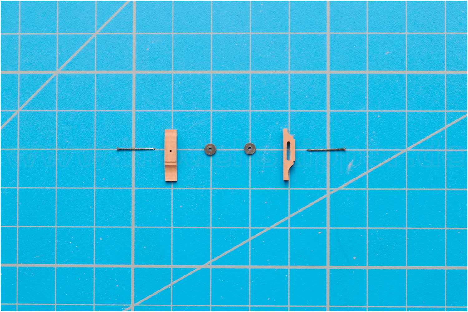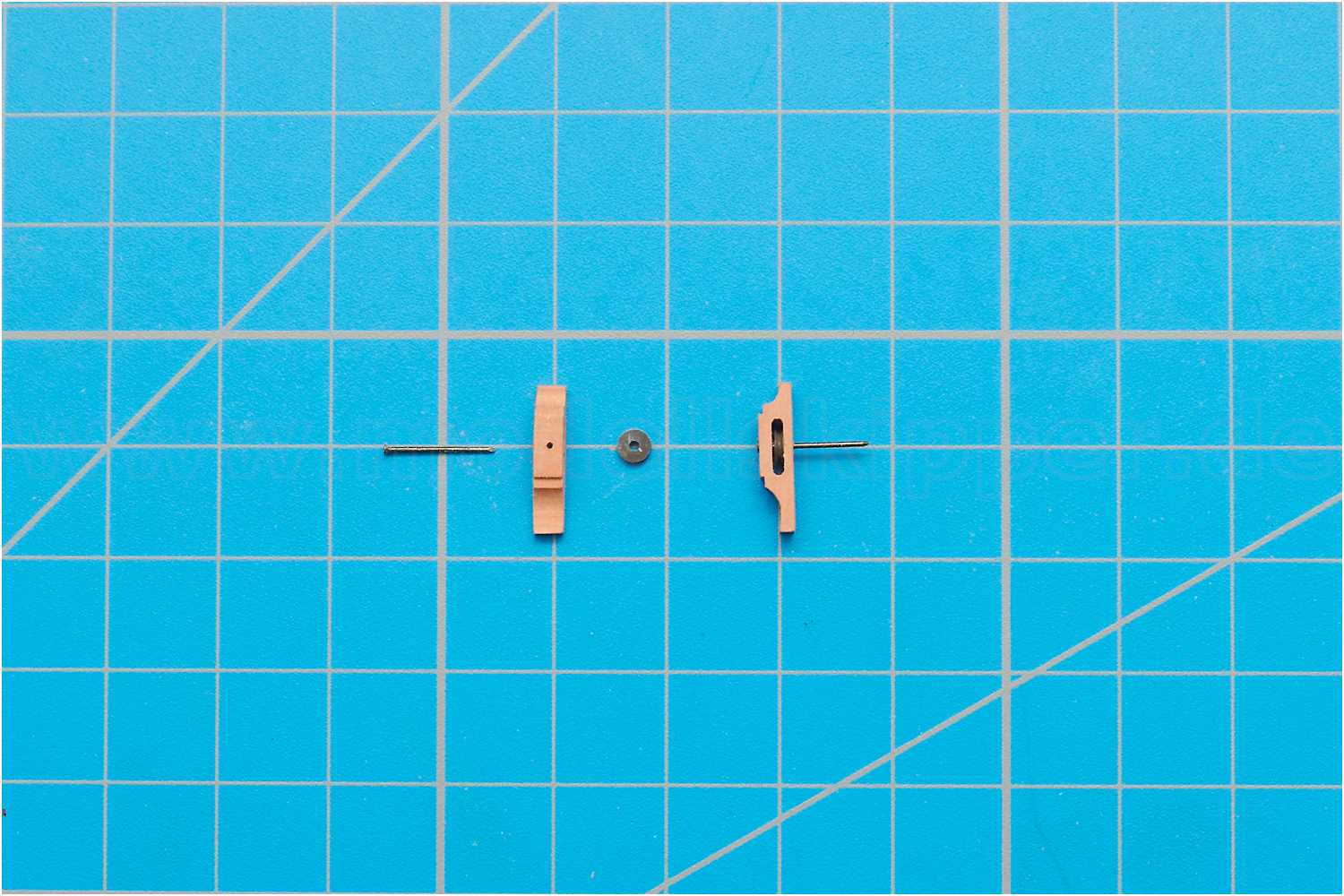 Haken und Bügel sind Ätzteile, bei denen ich mit einer Reibahle die Bohrungen für den Ring vergrößere.