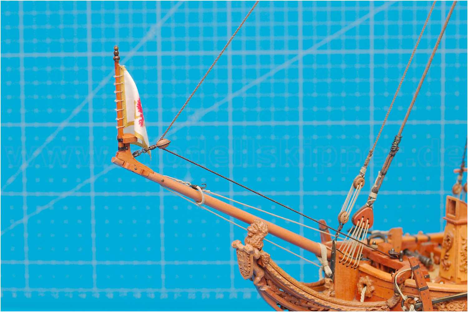 Am Bugspriettopp sind beidseitig jeweils ein Schildpatt für die Toppsegelbuliens angebracht. Diese erhalten profilierte Schmuckkanten.