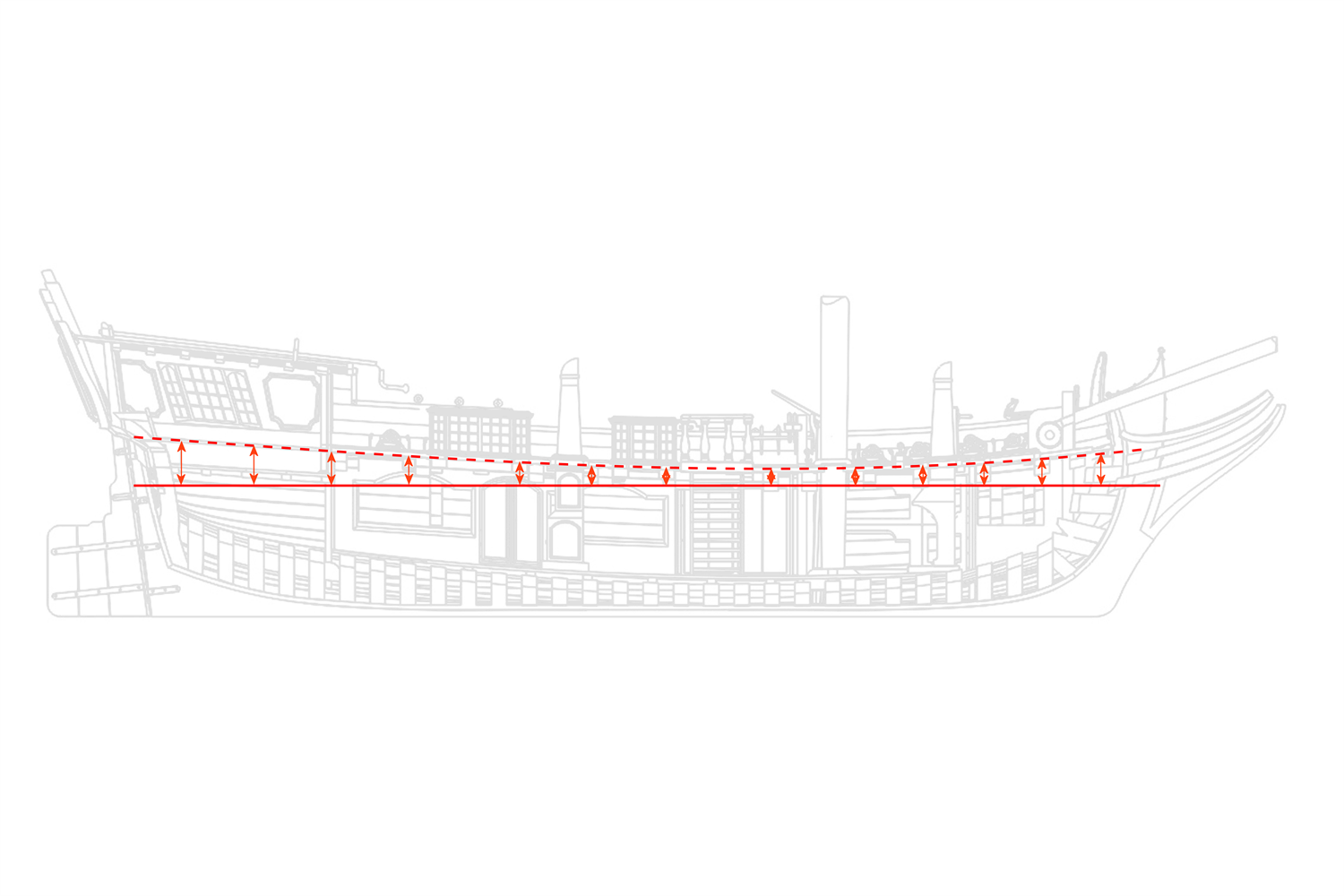 Zur Balkenbucht, der Biegung in Querrichtung, kommt der Decksprung hinzu, die Krümmung des Decks in Längsrichtung des Rumpfes.