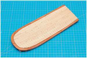 Bei einem älteren Projekt habe ich für die Decksplanken Ahorn verwendet. Hier störte mich allerdings, dass bei diesem Holz nach der Behandlung mit Lack oder Firnis oftmals eine Art "Mosaikmuster" zu sehen ist.