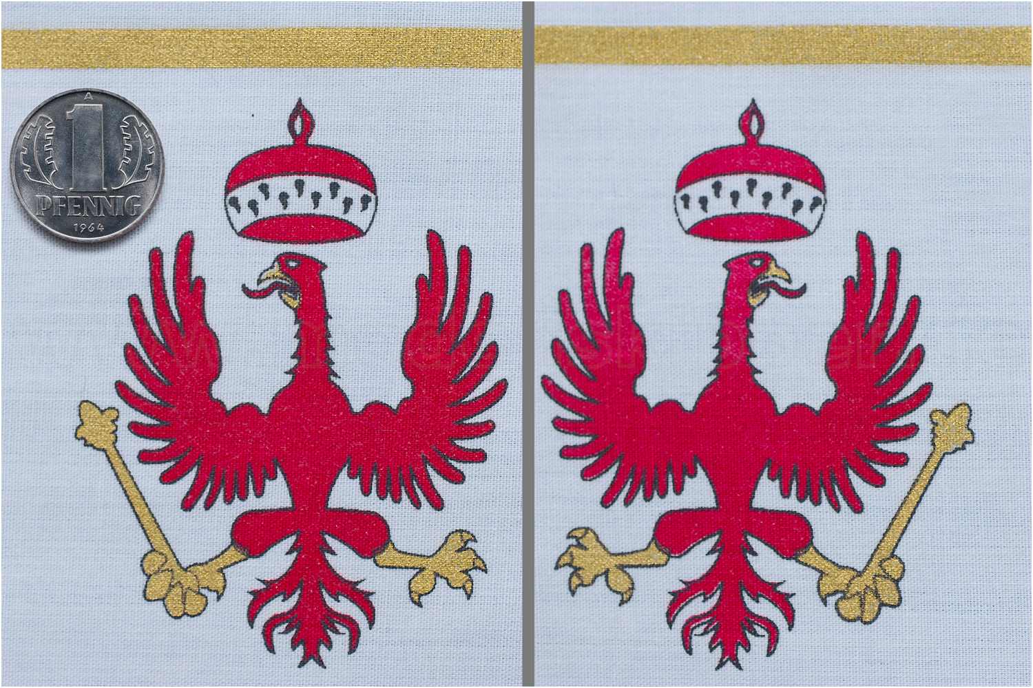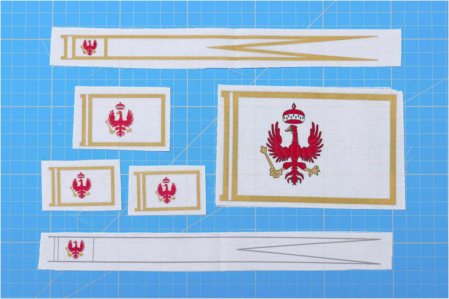 Die Flaggen sind beidseitig auf feinem Baumwollstoff gedruckt, noch in unbearbeitetem Zustand.