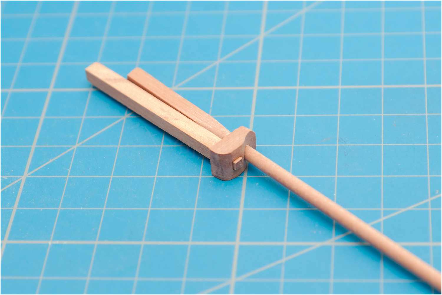 Mit einem Nutbrettchen schleife ich den Göschmast und klebe ihn am Knie fest, die Beschläge imitiere ich mit schwarzer Pappe.