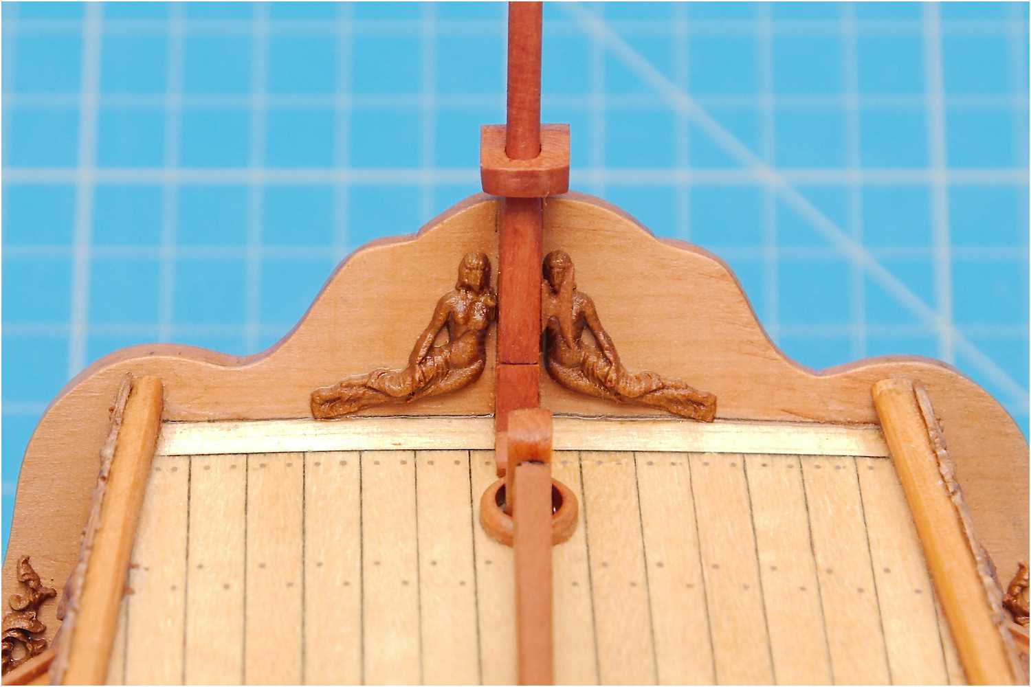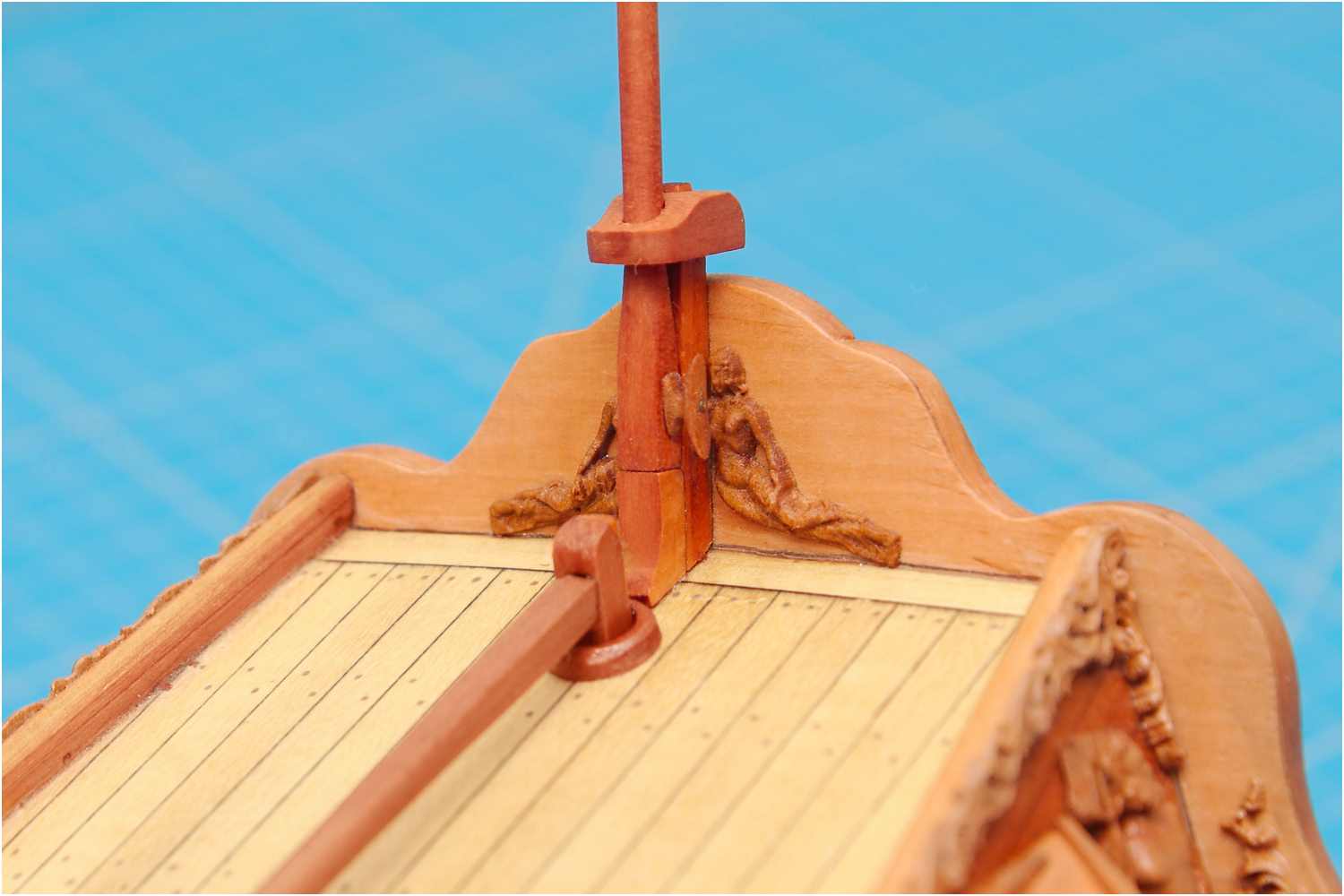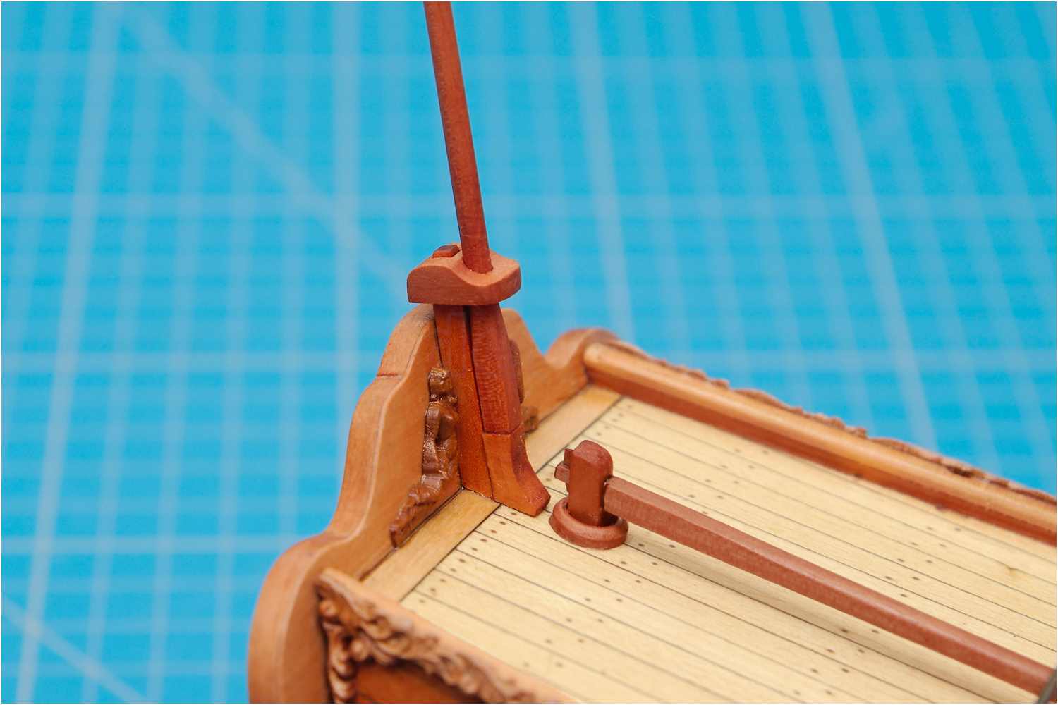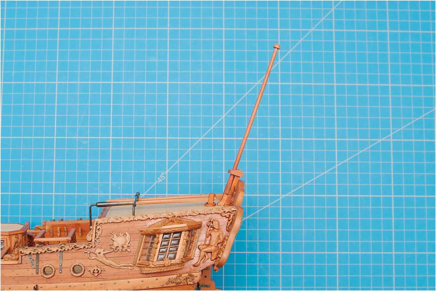 Den Flaggenmast habe ich klassisch auf der Drechselbank per Hand mit Schleifpapier verjüngt.