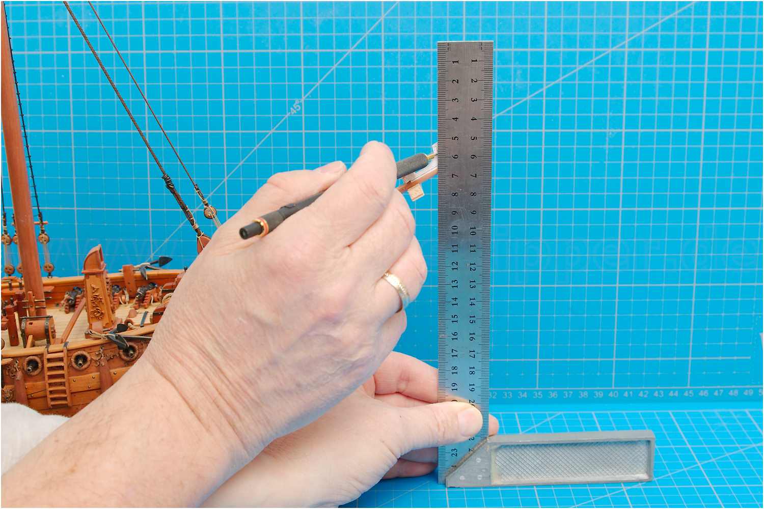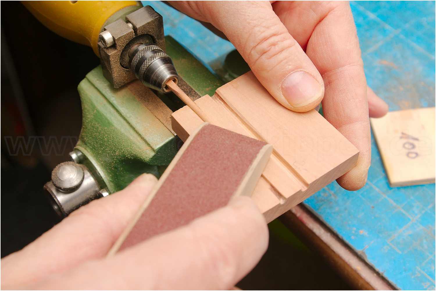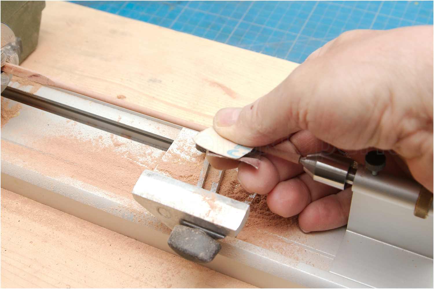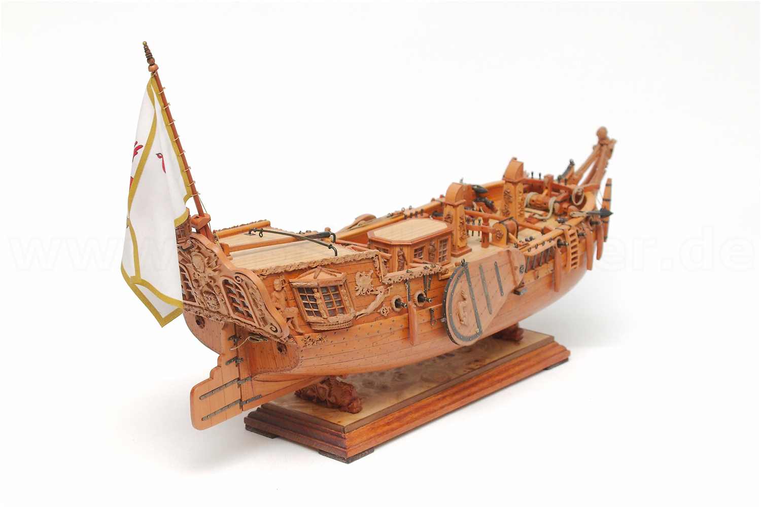Den Flaggenmast habe ich klassisch auf der Drechselbank per Hand mit Schleifpapier verjüngt.