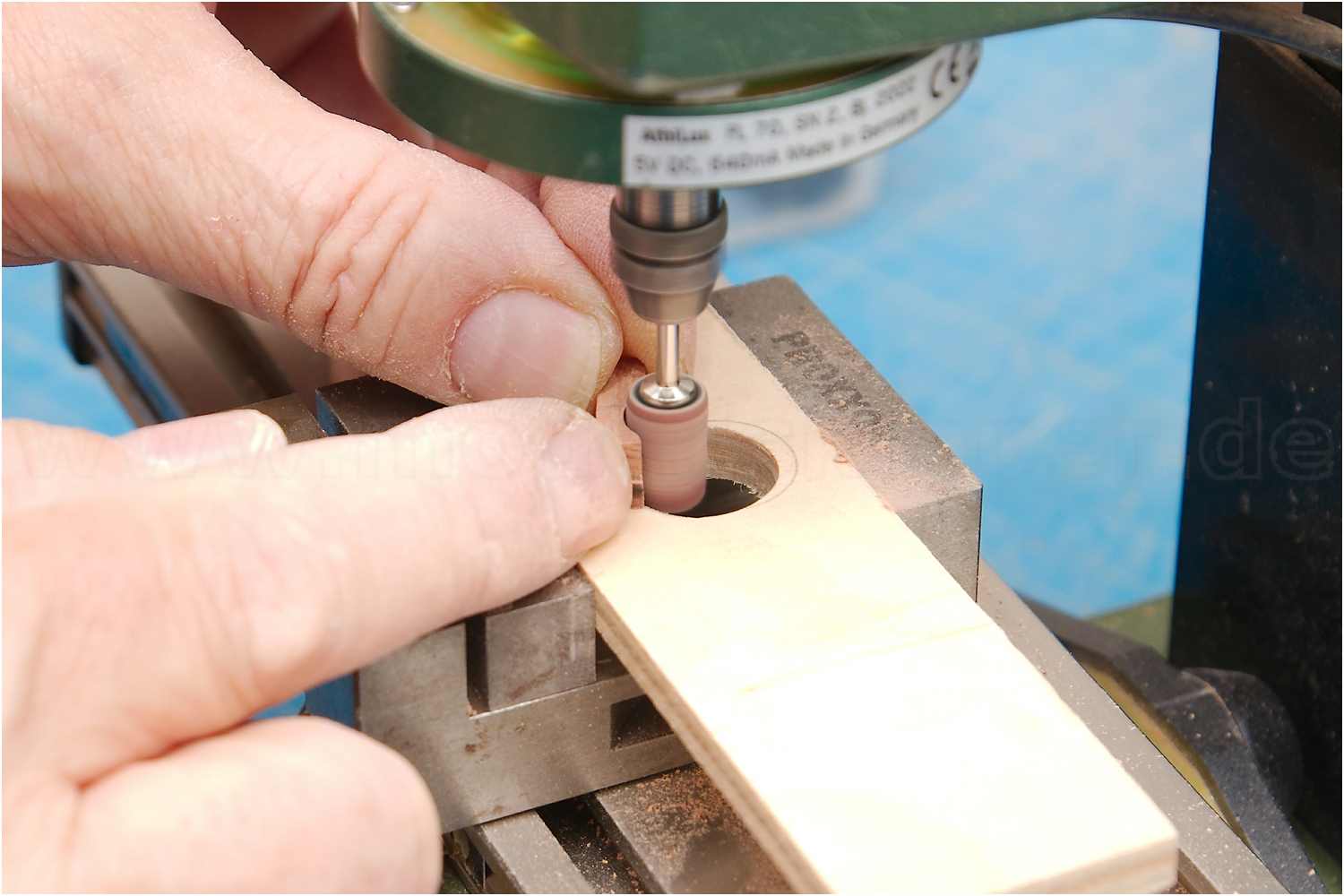 Für das Flaggenknie auf dem Bugspriettopp drucke ich mir eine Schleifschablone aus und fräse den Bogen mit einem Rundschleifkörper.