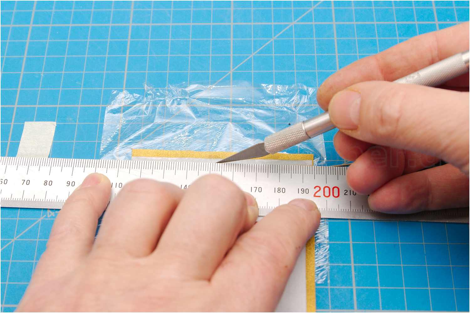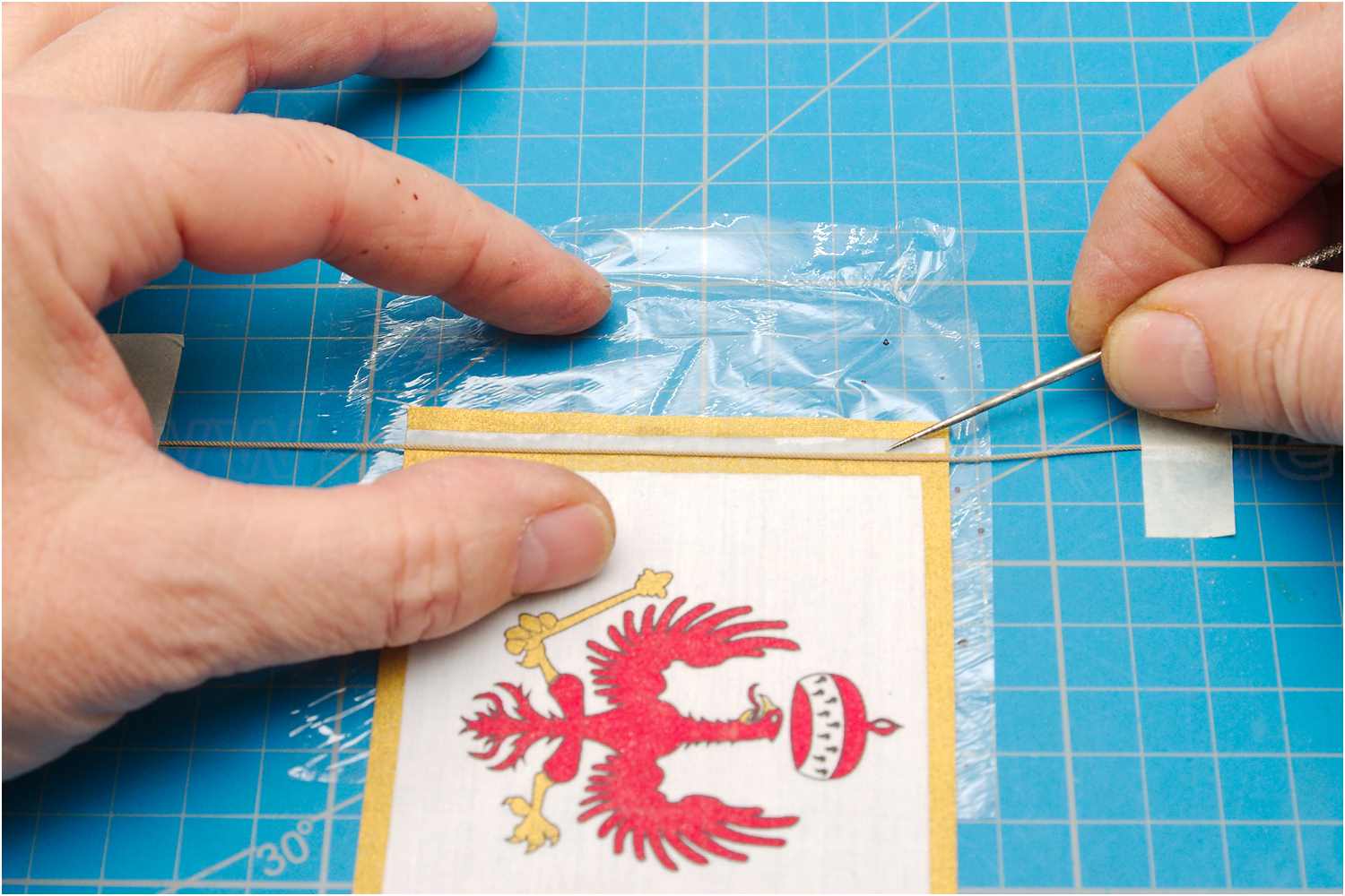 Das Verstärkungsseil am Vorliek fixiere ich mit mittelflüssigem Sekundenkleber auf dem Flaggenstoff und schneide überschüssigen Stoff mit einem Skalpell ab.