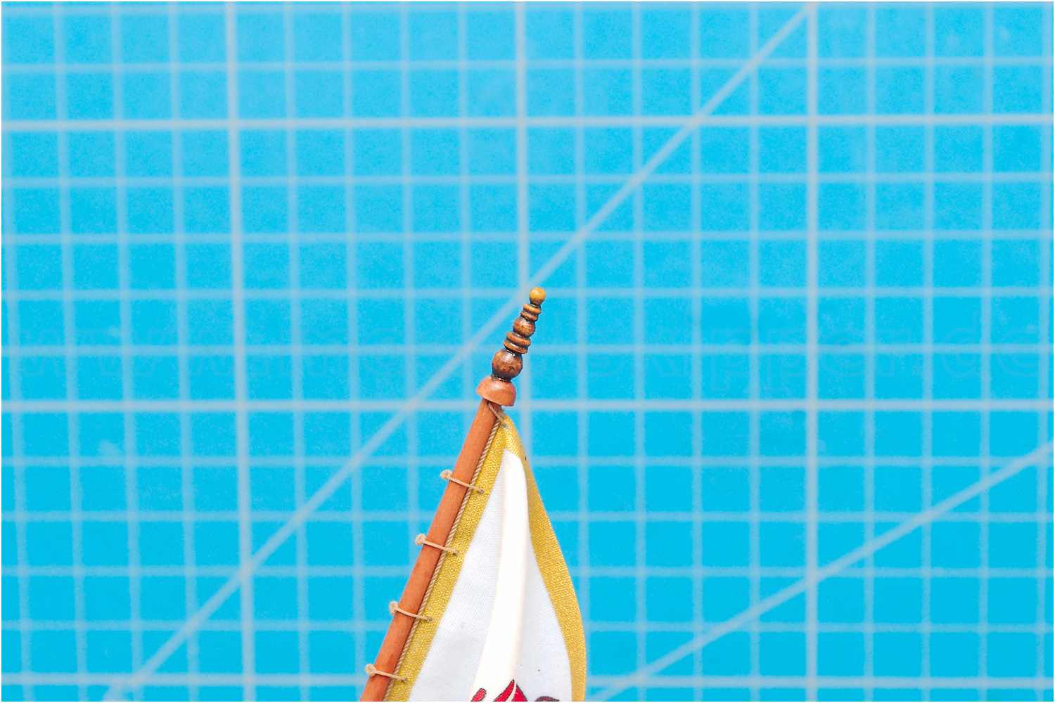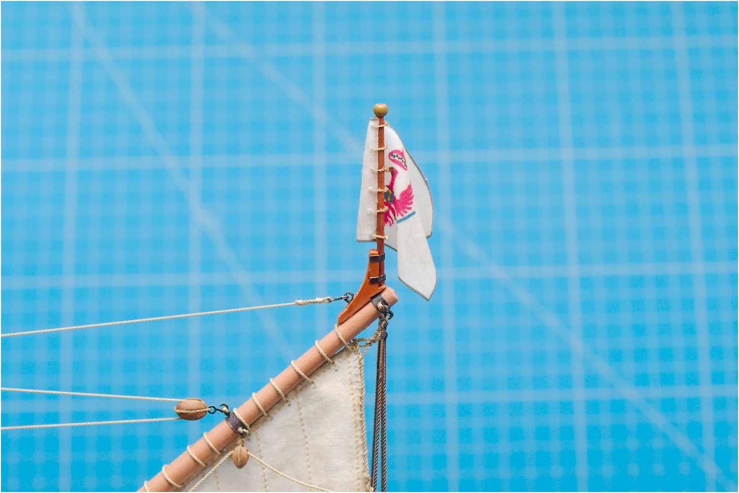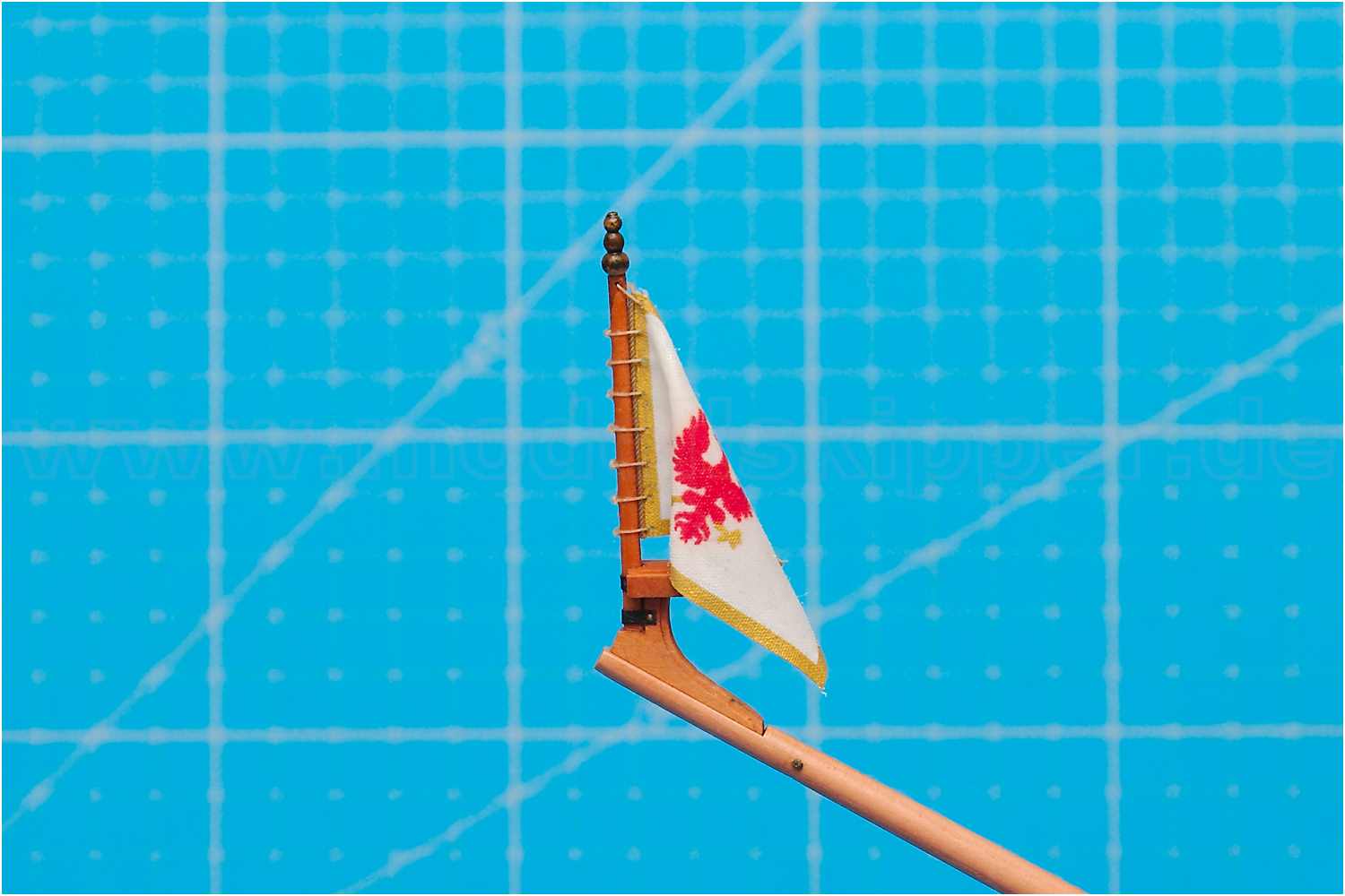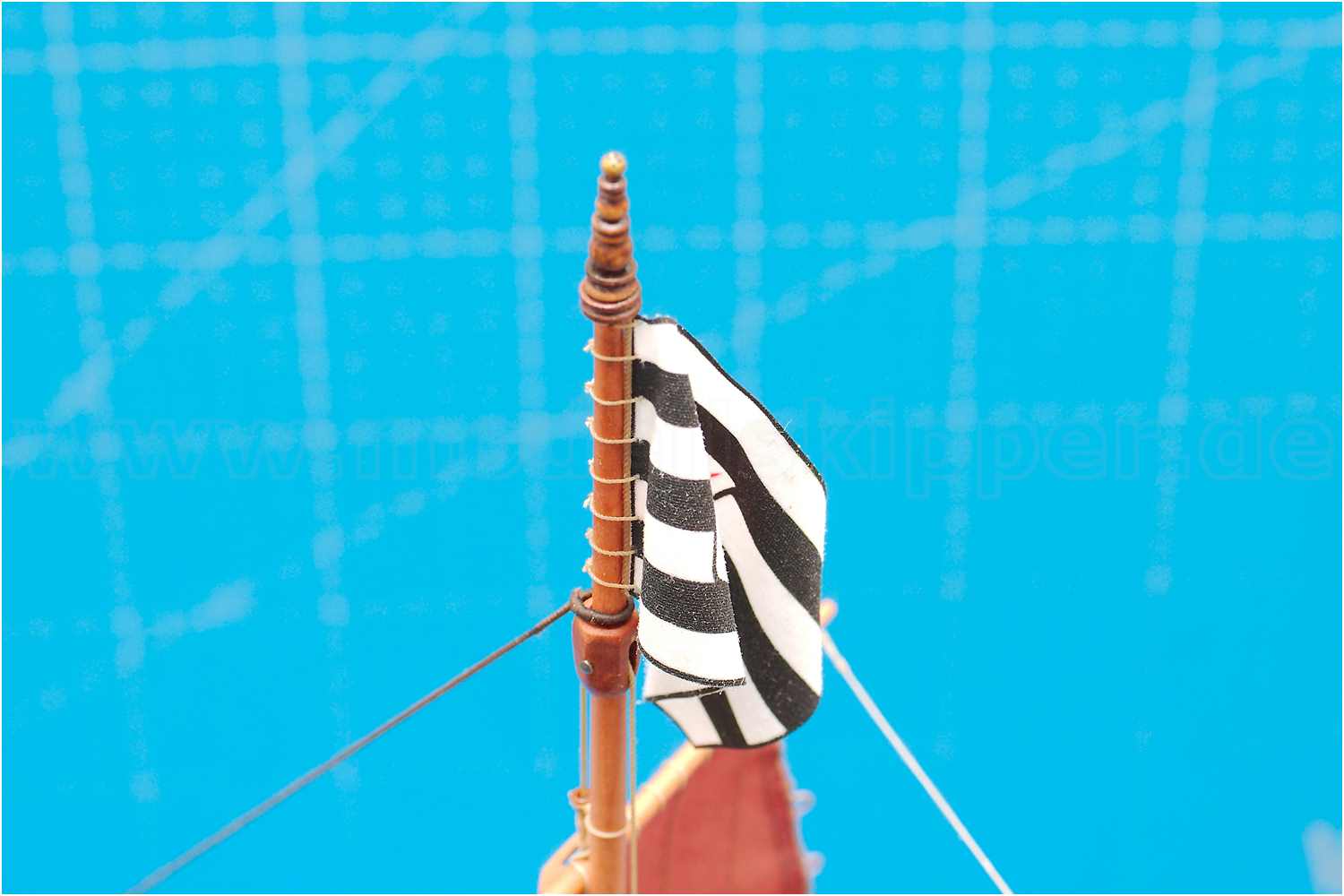 Die Flagge ist angebändselt und der Flaggenknopf hat ein wenig Dekor halten, jedoch waren die ersten Schleifenbändsel zu dick, sodass ich auf Kreuzknoten ausgewichen bin.