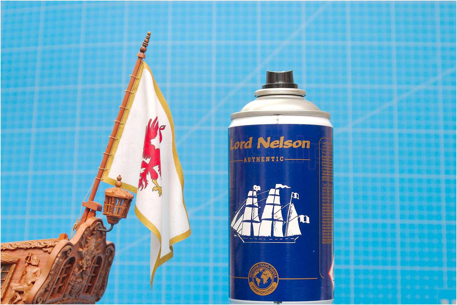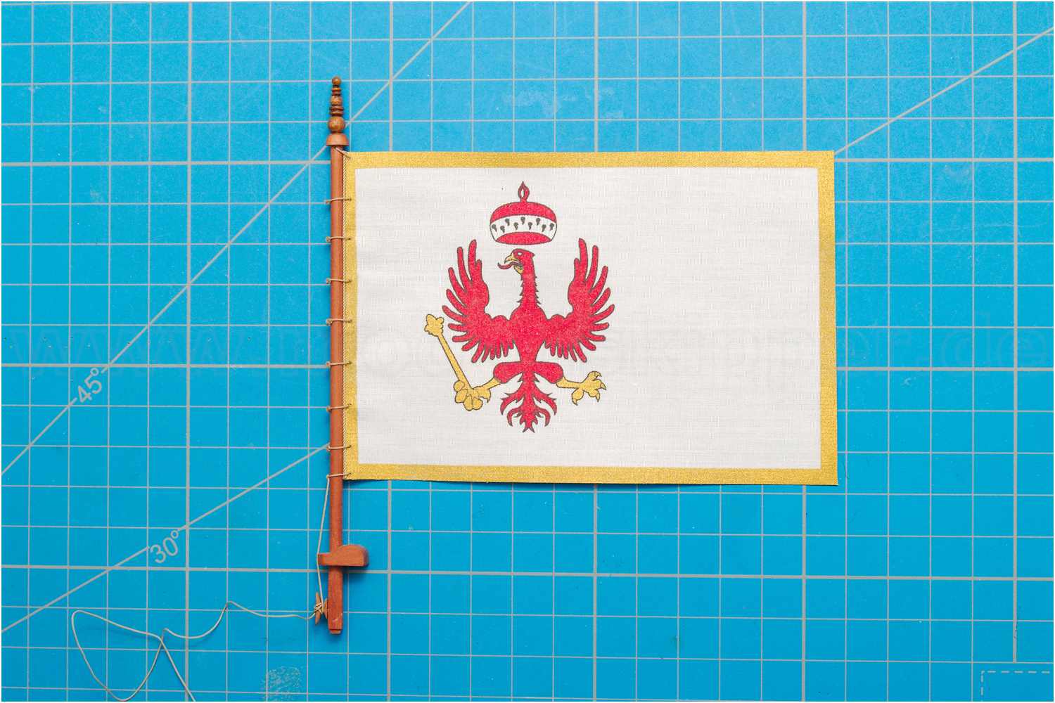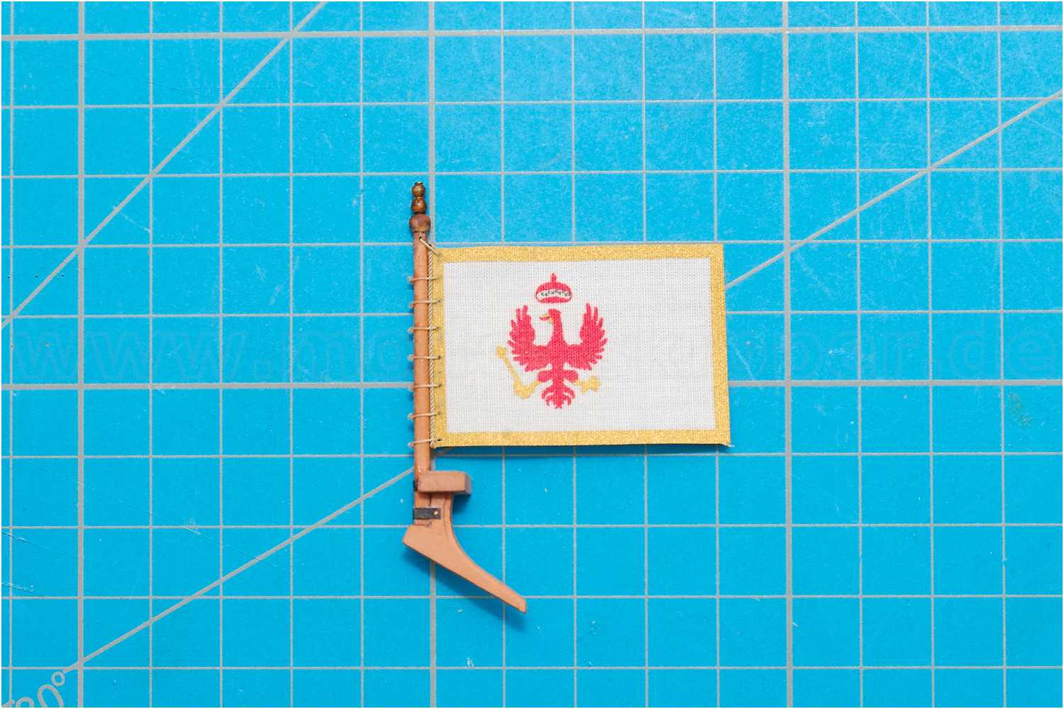 Abschließend wurde die Flagge mit mattem Sprühlack gestärkt, um am Mast eine möglichst natürlichen Faltenwurf zu erhalten.