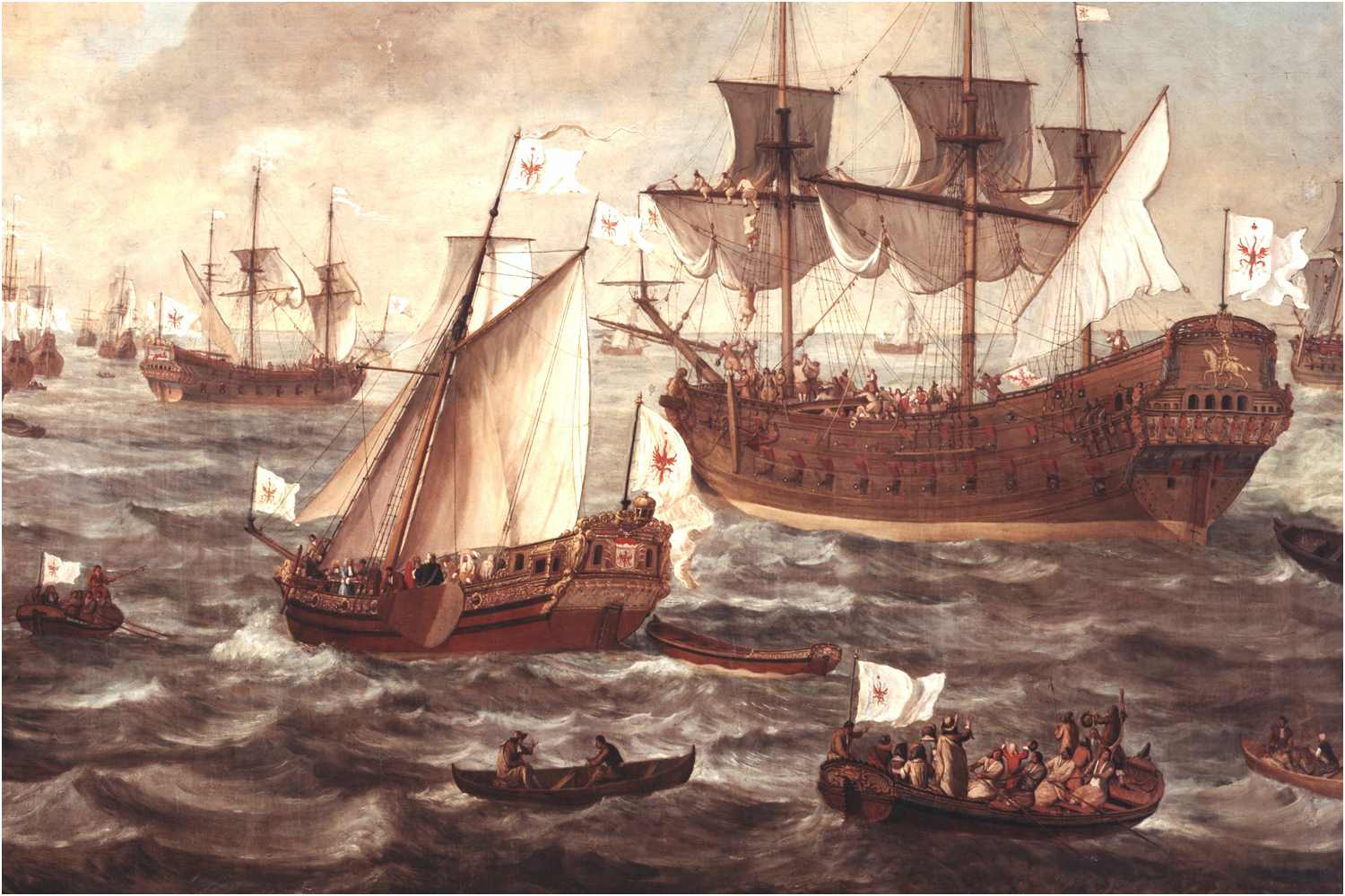 Auf dem Gemäldeausschnitt und beim Replik der Batavia sieht man gut, wie die Flaggen angebunden wurden