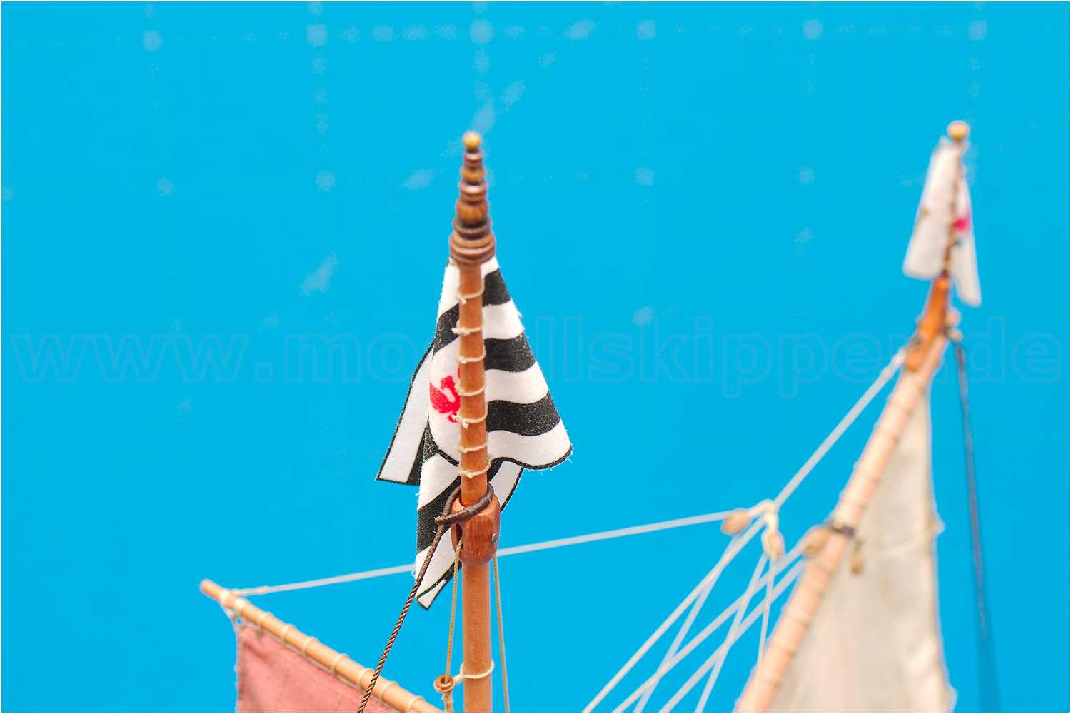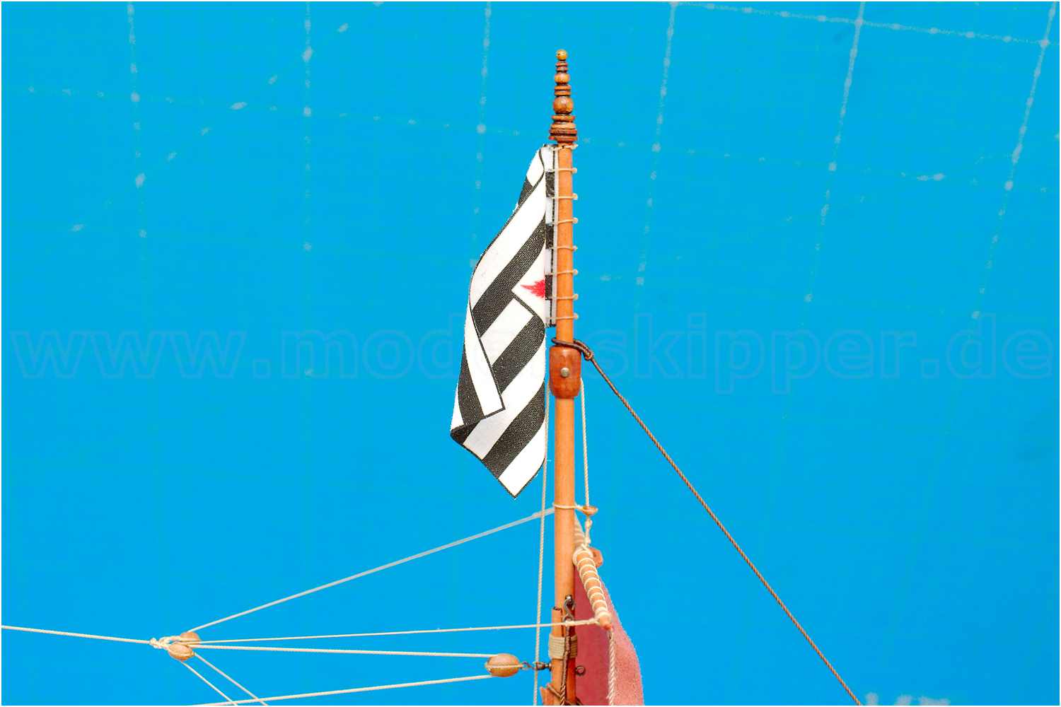 Die Flagge habe ich erst nach dem Anschlagen des Gaffelsegels aufgeklebt.