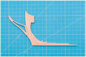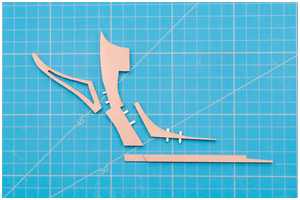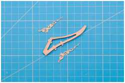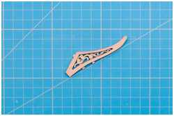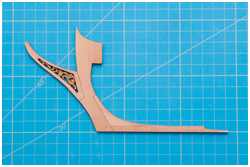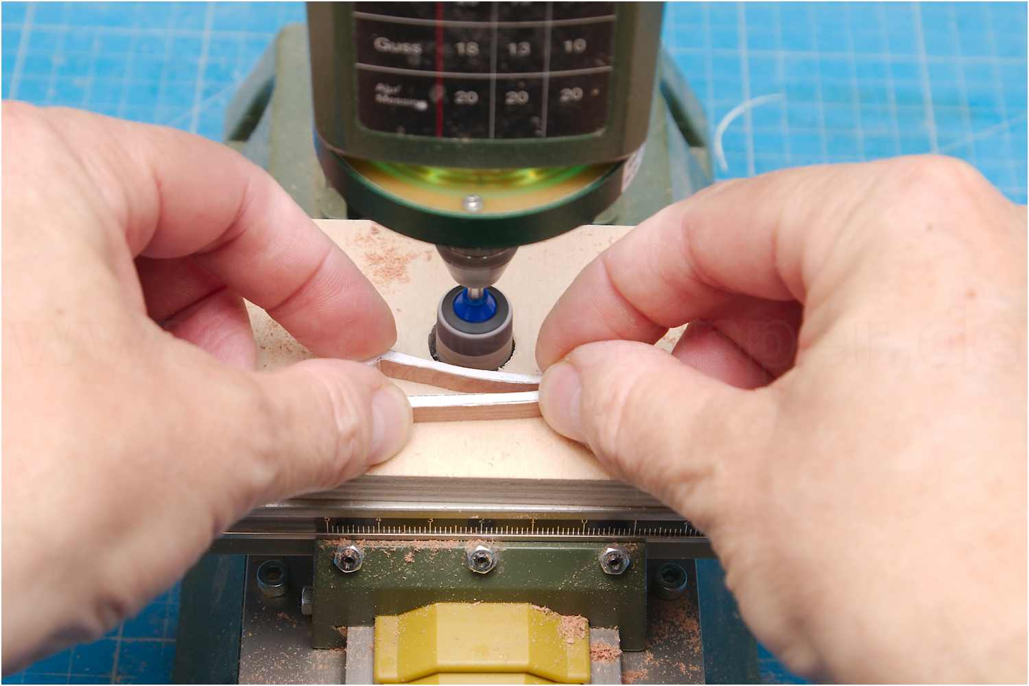 Dazu drucke ich mir eine Schablone aus, klebe diese auf 5-mm-Birnbaumvollholz und säge es mit der Bandsäge aus.