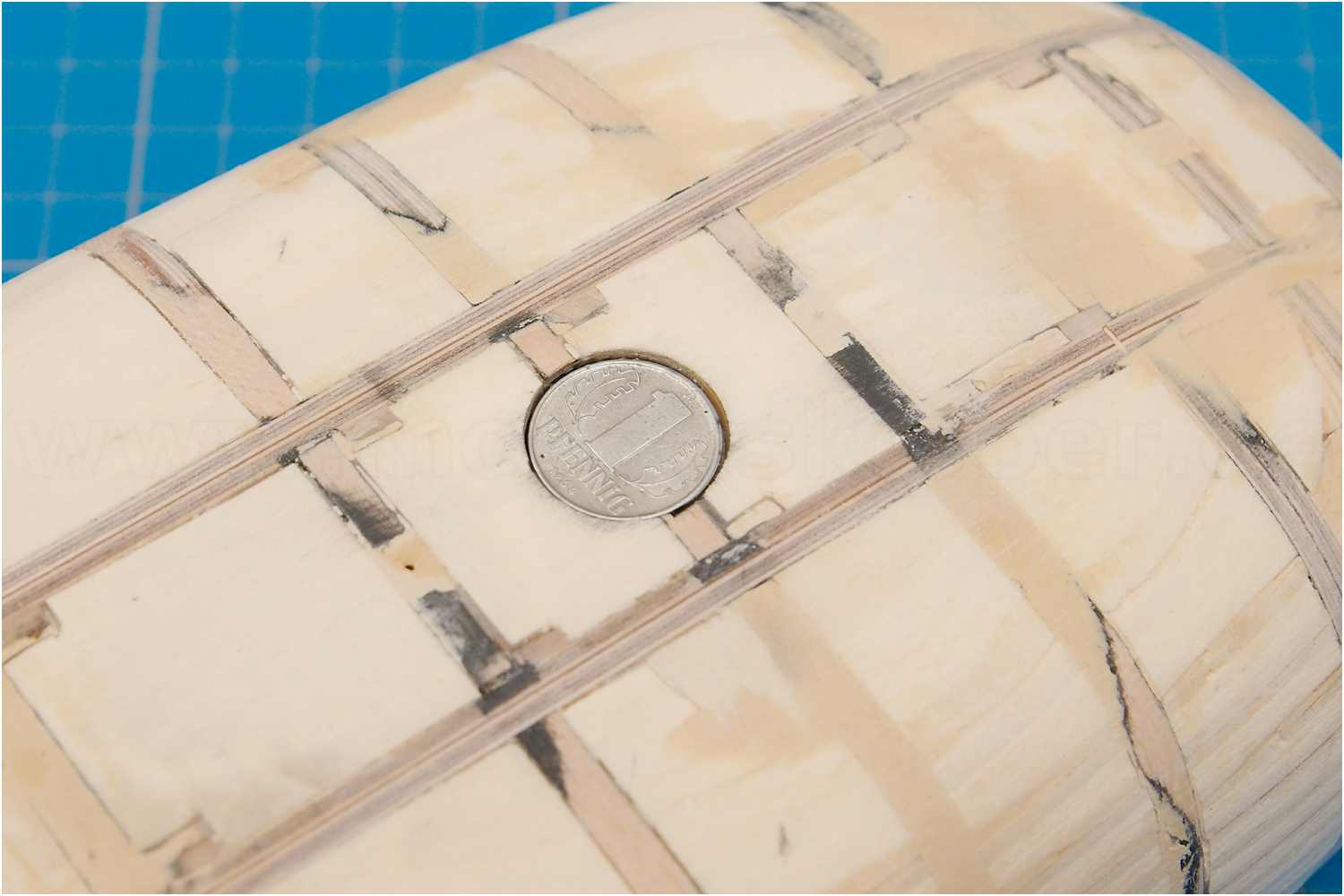 Dafür habe ich in den Rumpfboden bei der Mastmalle ein Sackloch gebohrt und eine Münze eingeklebt.