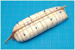 Nach dem kompletten Verleimen aller Einzelteile, habe ich noch für die "falsche" Sponung eine Leiste auf die Innenseite des Kiels geklebt, abschließend alles unter den Rumpf verleimt und bis zum Aushärten des Klebers mit Draht fixiert.