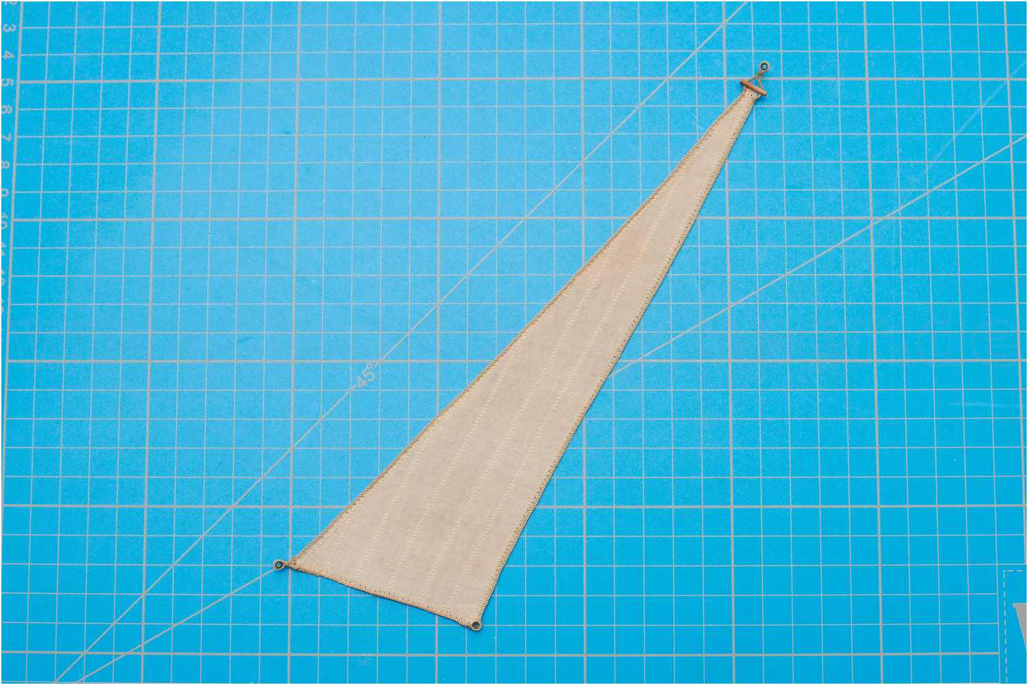 Am Kopf des Segels wird die Kausch für das Klüverfall mit einer Art Spreizholz mit dem Liektau eingefasst. Ein Details, das im Bauplan gezeichnet ist und nach NJ modifiziert wurde.