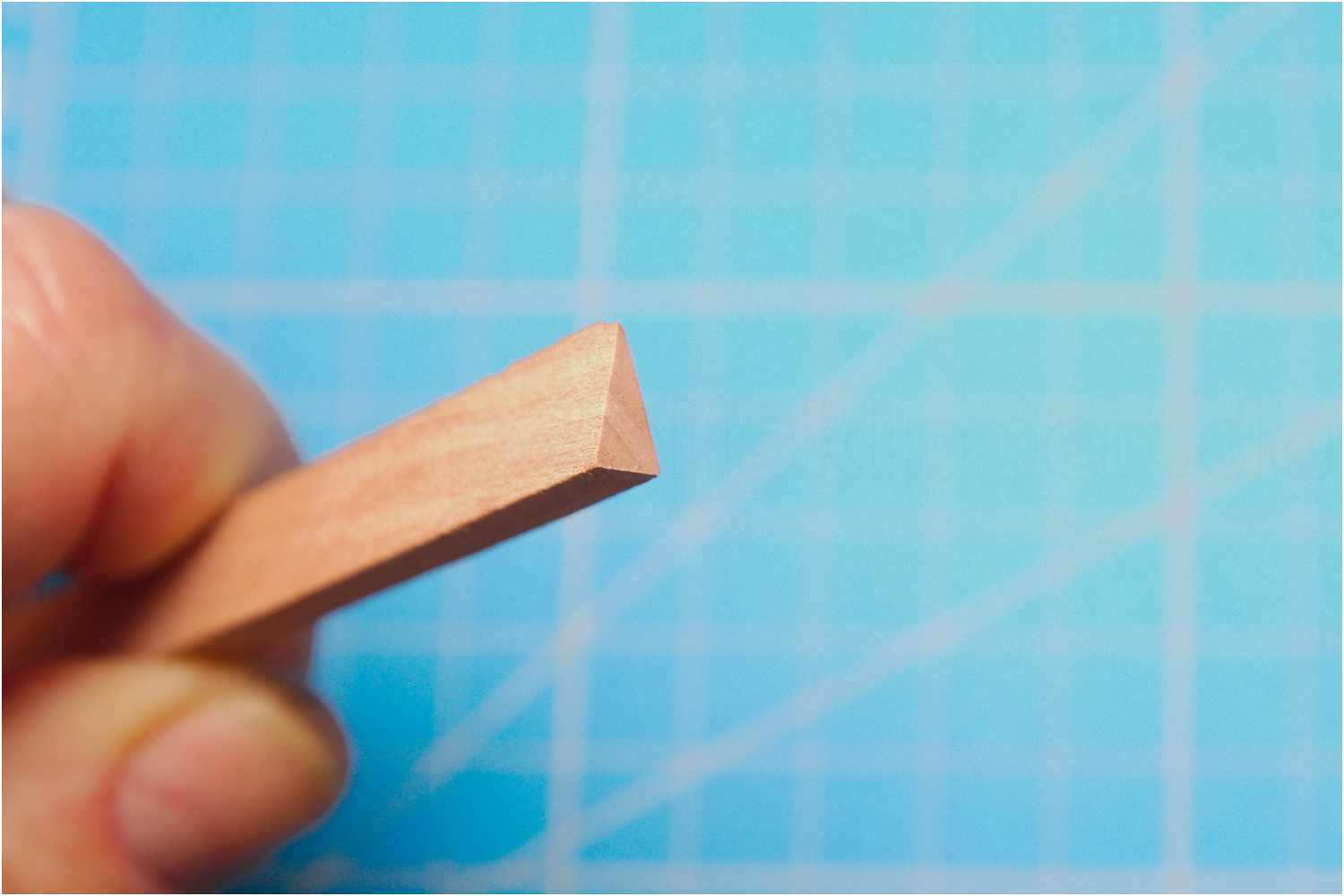Dazu säge ich eine Leiste mit einseitiger Abschrägung, schneide davon kleine Keilstücke ab und fräse in den Mast kleine Vertiefungen, in die die Klampen eingeklebt werden. So kann ich sie fluchtend, abbruchsicher und quasi "bündig" auf der abgerundeten Oberfläche des Masts befestigen.