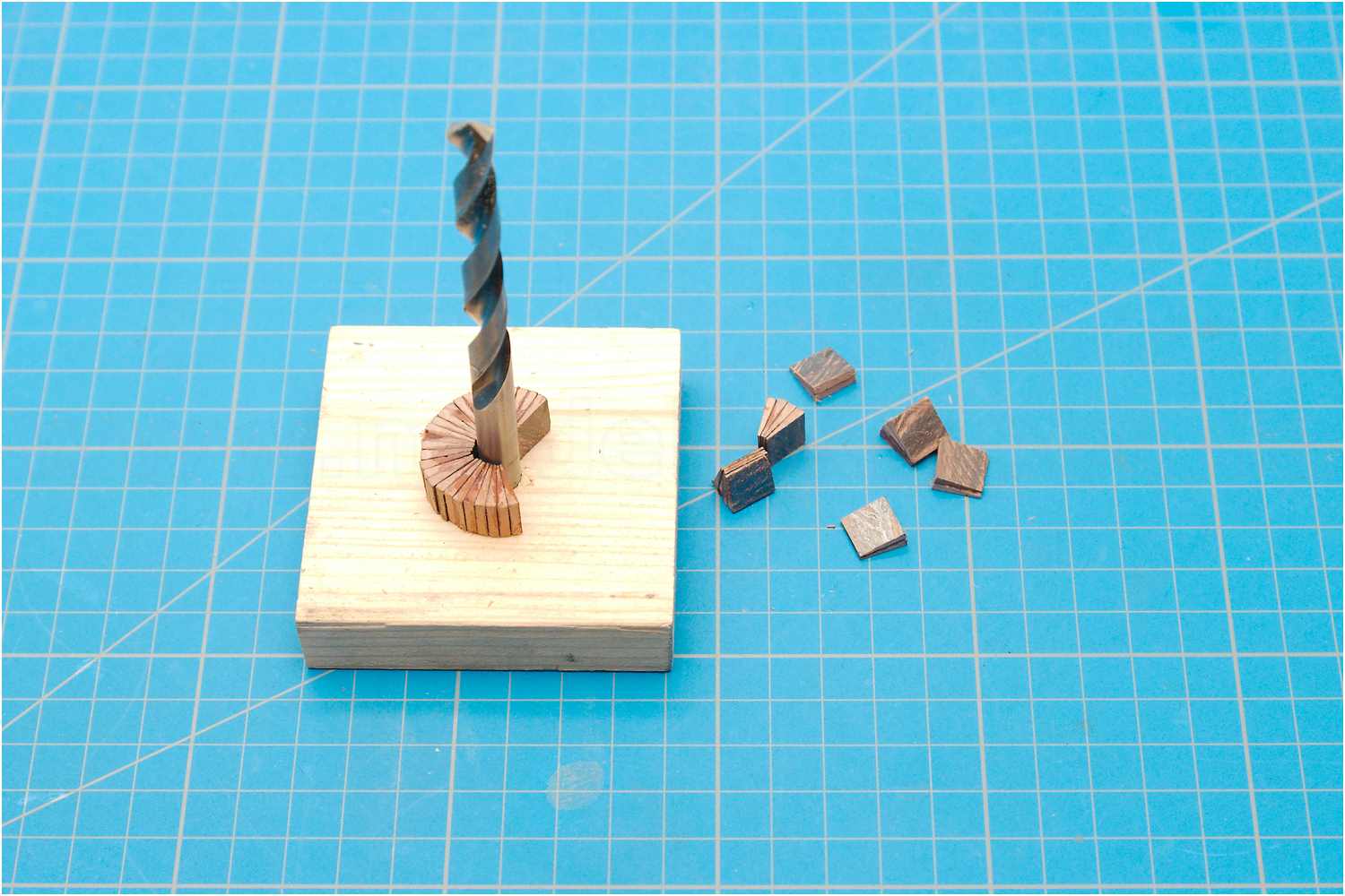 Nach ein paar Versuchen erschienen mir 24 Keile praktikabel zu sein, das entspricht einer Anschrägung von 15°, was sich gut mit der Kreissäge realisieren ließ.
