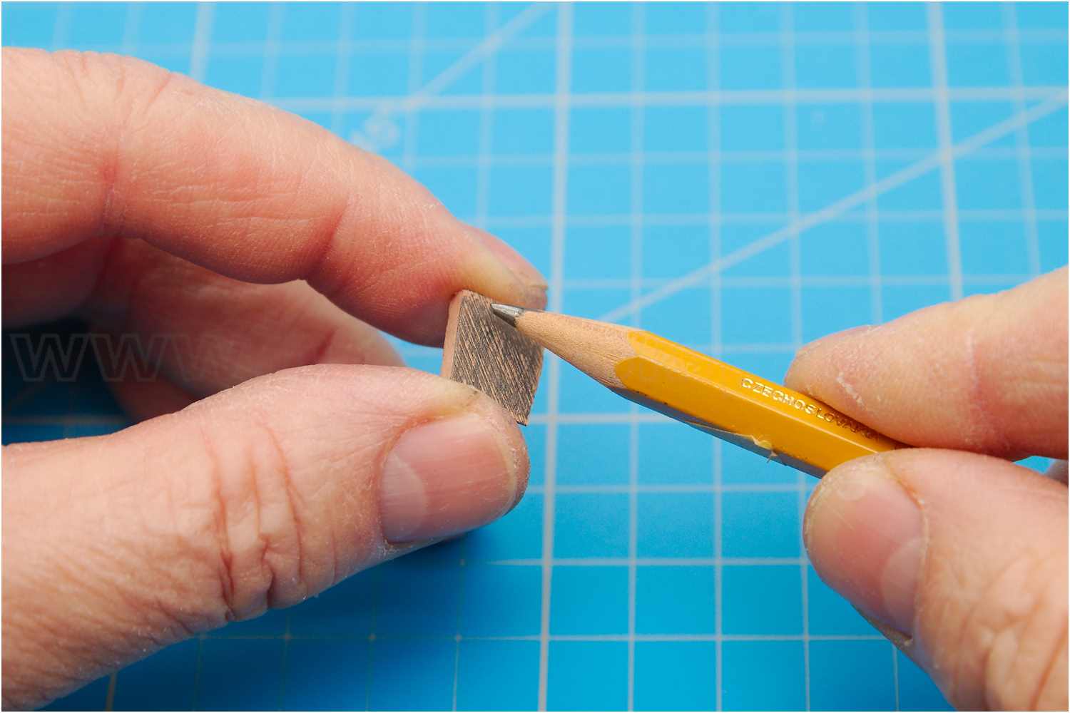 Aus der angeschrägte Leiste schneide ich mir die benötigte Anzahl Segment ab, "kalfatere" die Fugen mit einem weichem Bleistift und klebe sie nach und nach zu einem Ring zusammen.