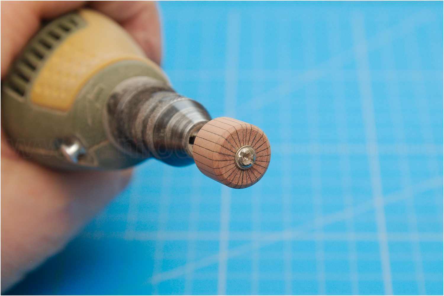 Dazu erhält das Brett an den Kanten der Ober- und Unterseite einen Absatz mit Hilfe einer Abstands-/Führungshülse, wird abschließend abgerundet und auf dem Hummer verklebt.