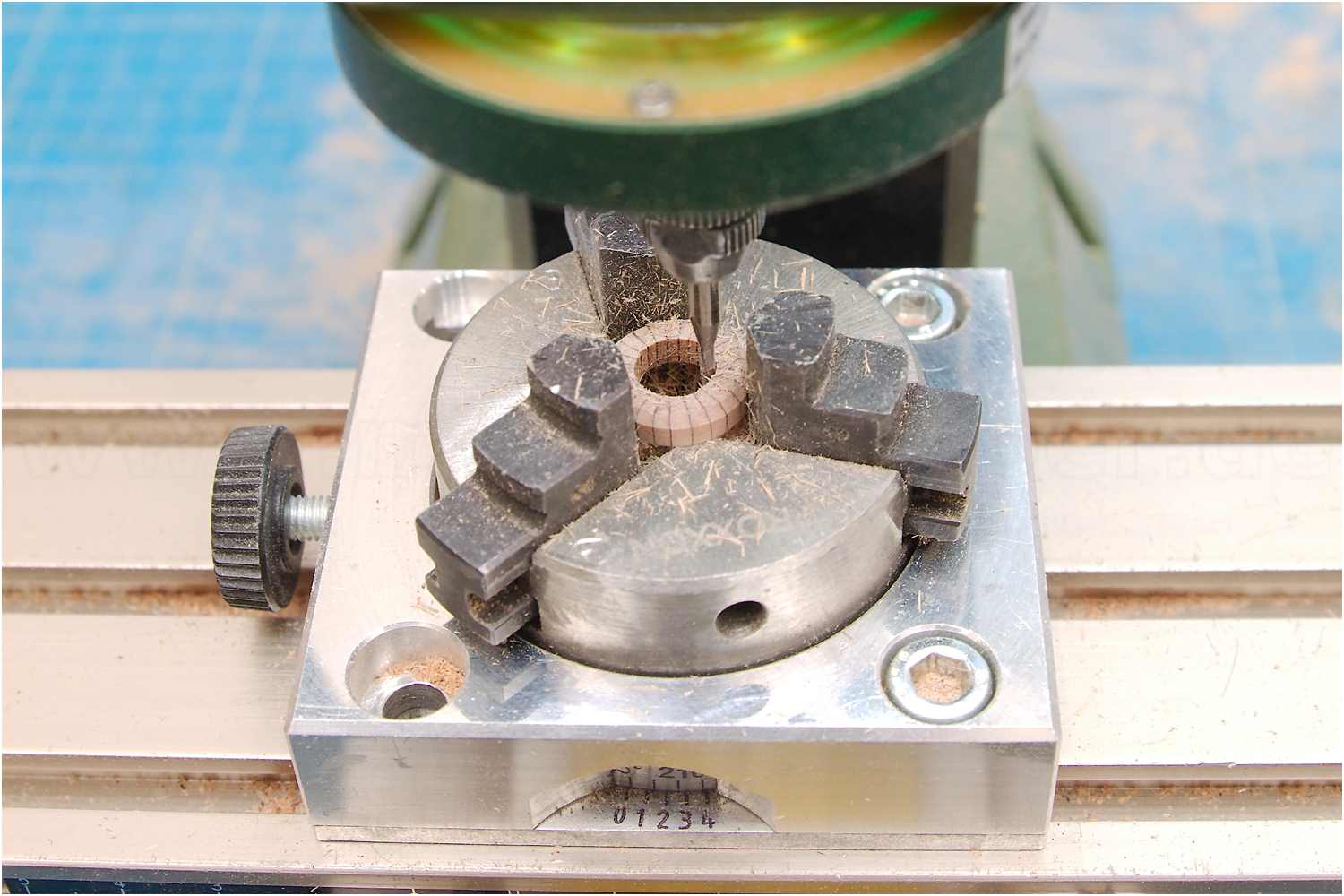 Den Arbeitstisch verschiebe ich dann step-by-step in der Waagerechten, erweitere so das Mastloch bis der gewünschte Durchmesser der Bohrung erreicht ist, ähnlich wie das Prinzip des Ausdrehens.