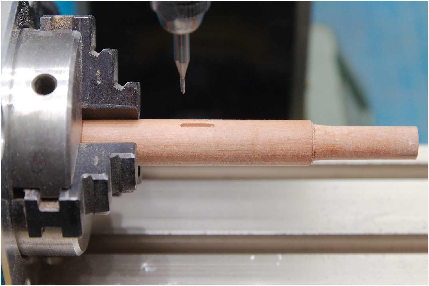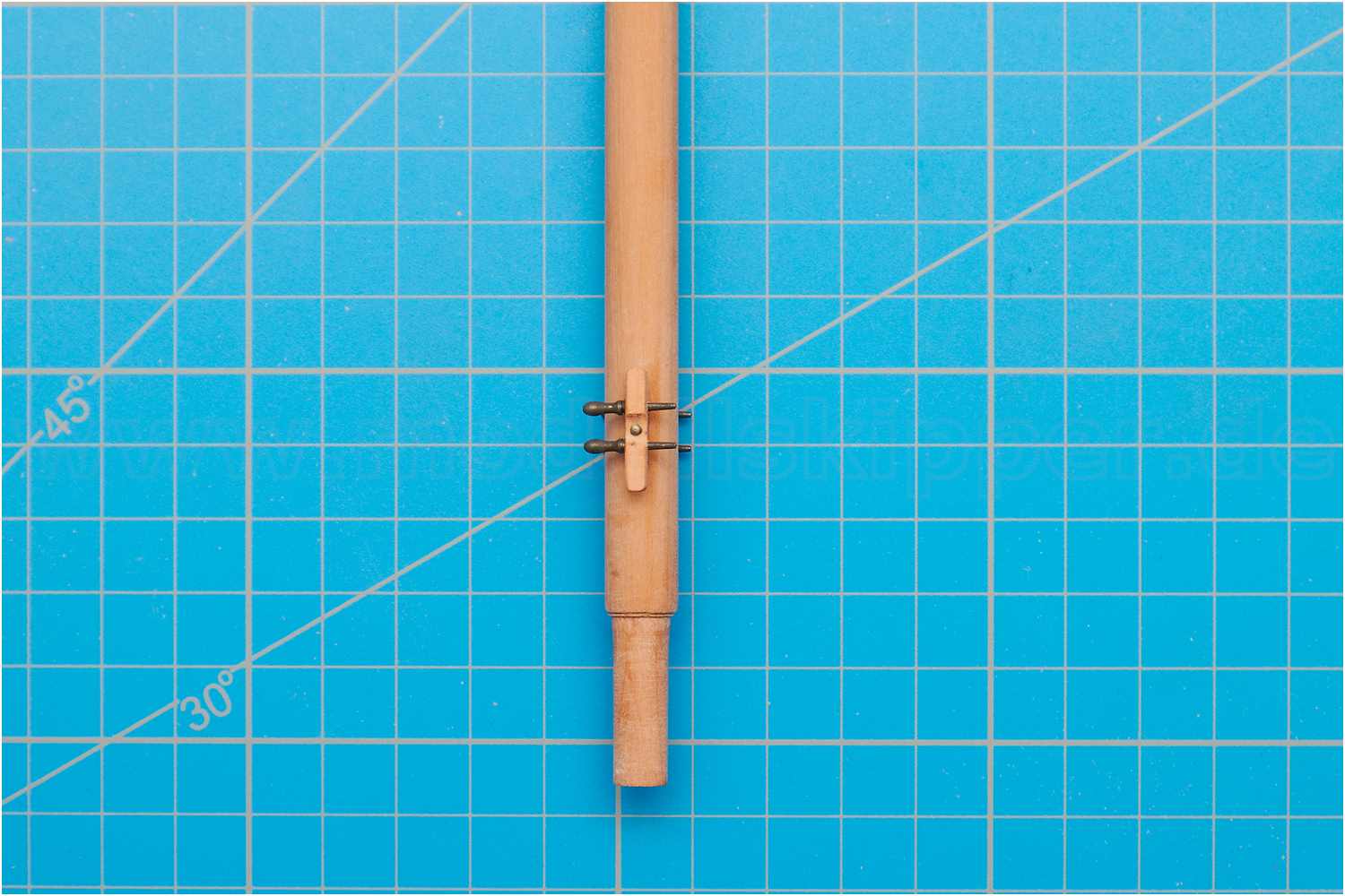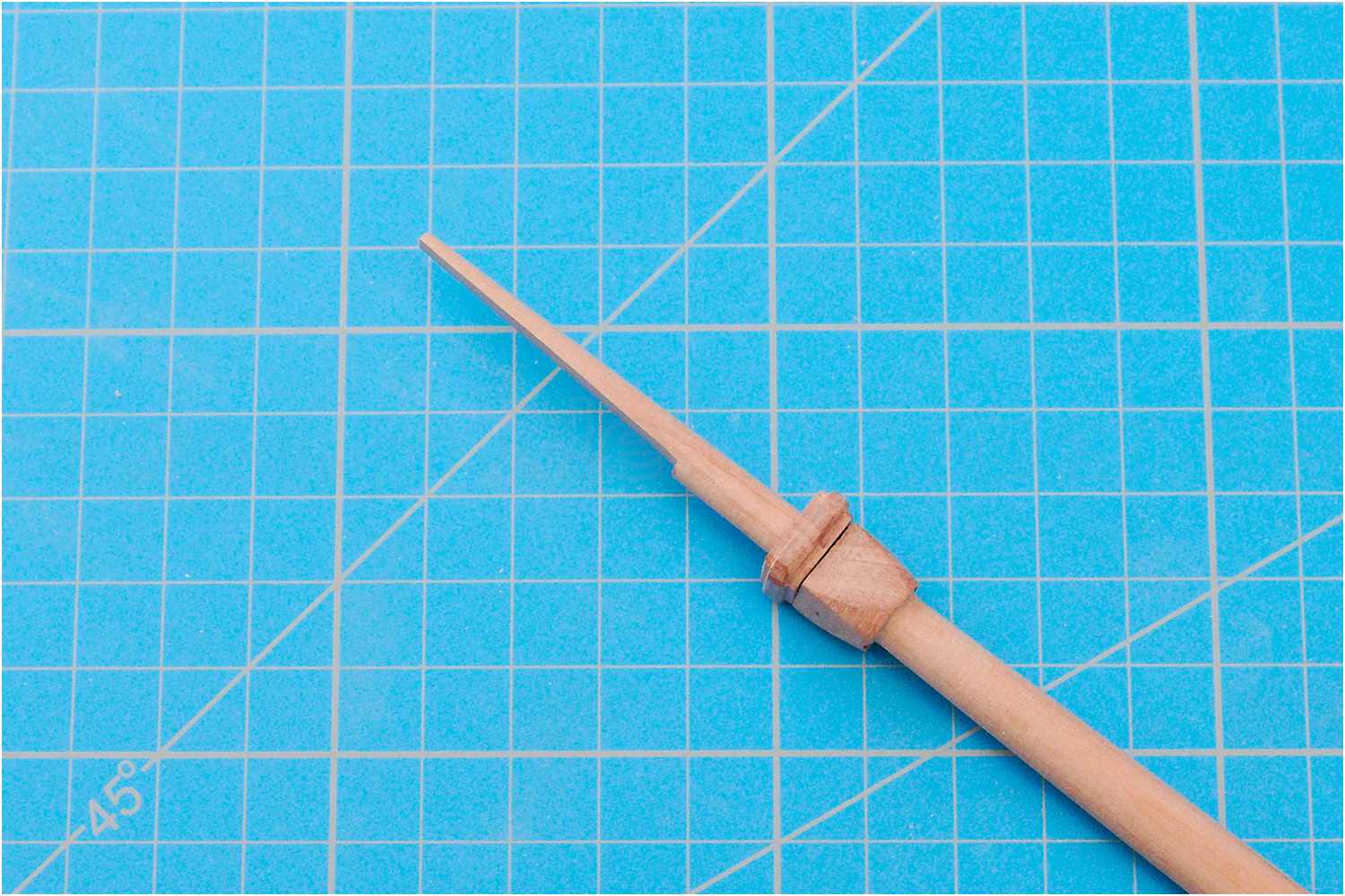 Die Stenge wird ebenfalls gedrechselt und erhält auch eine Abschrägung, aber quasi gespiegelt.