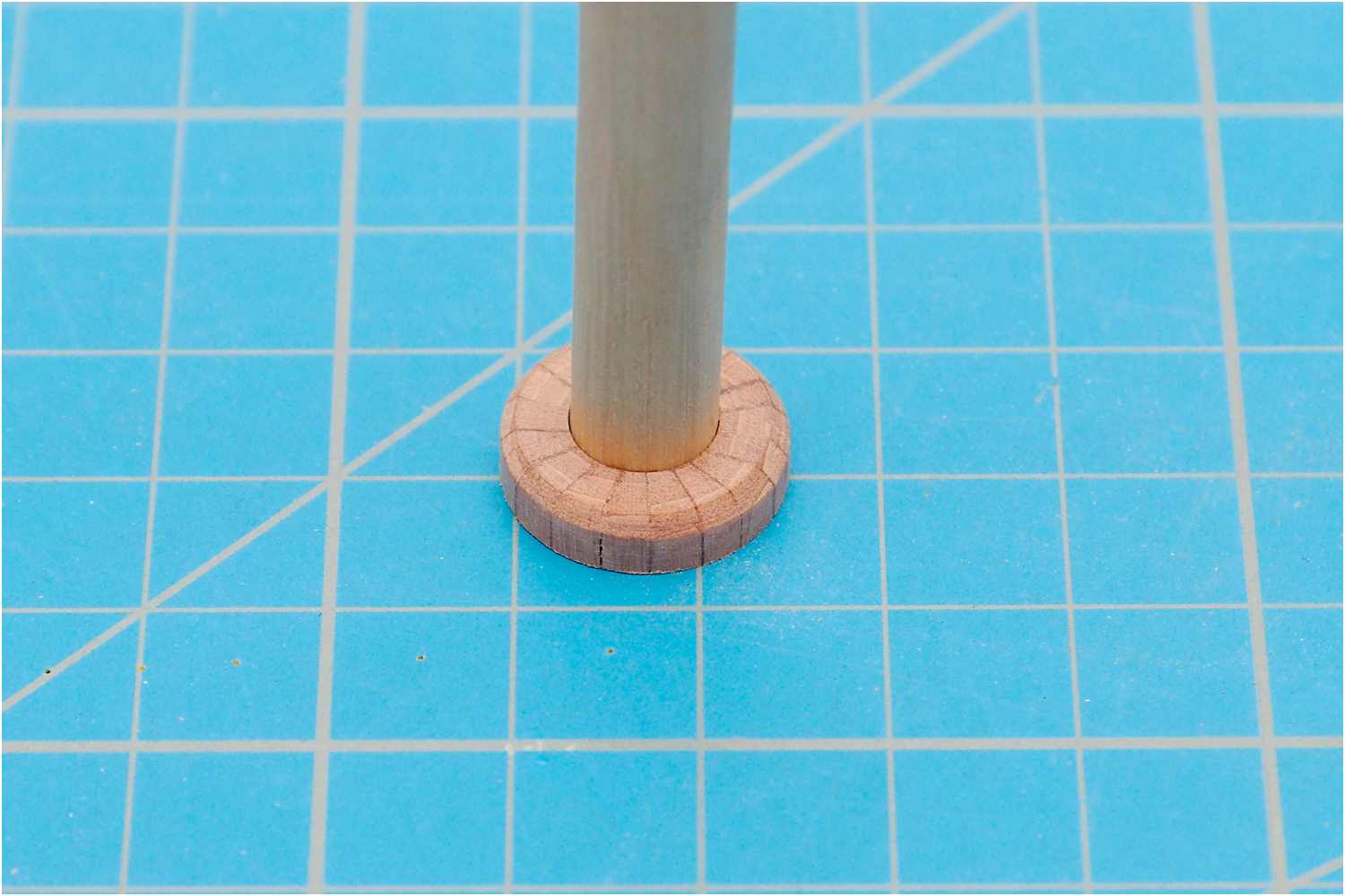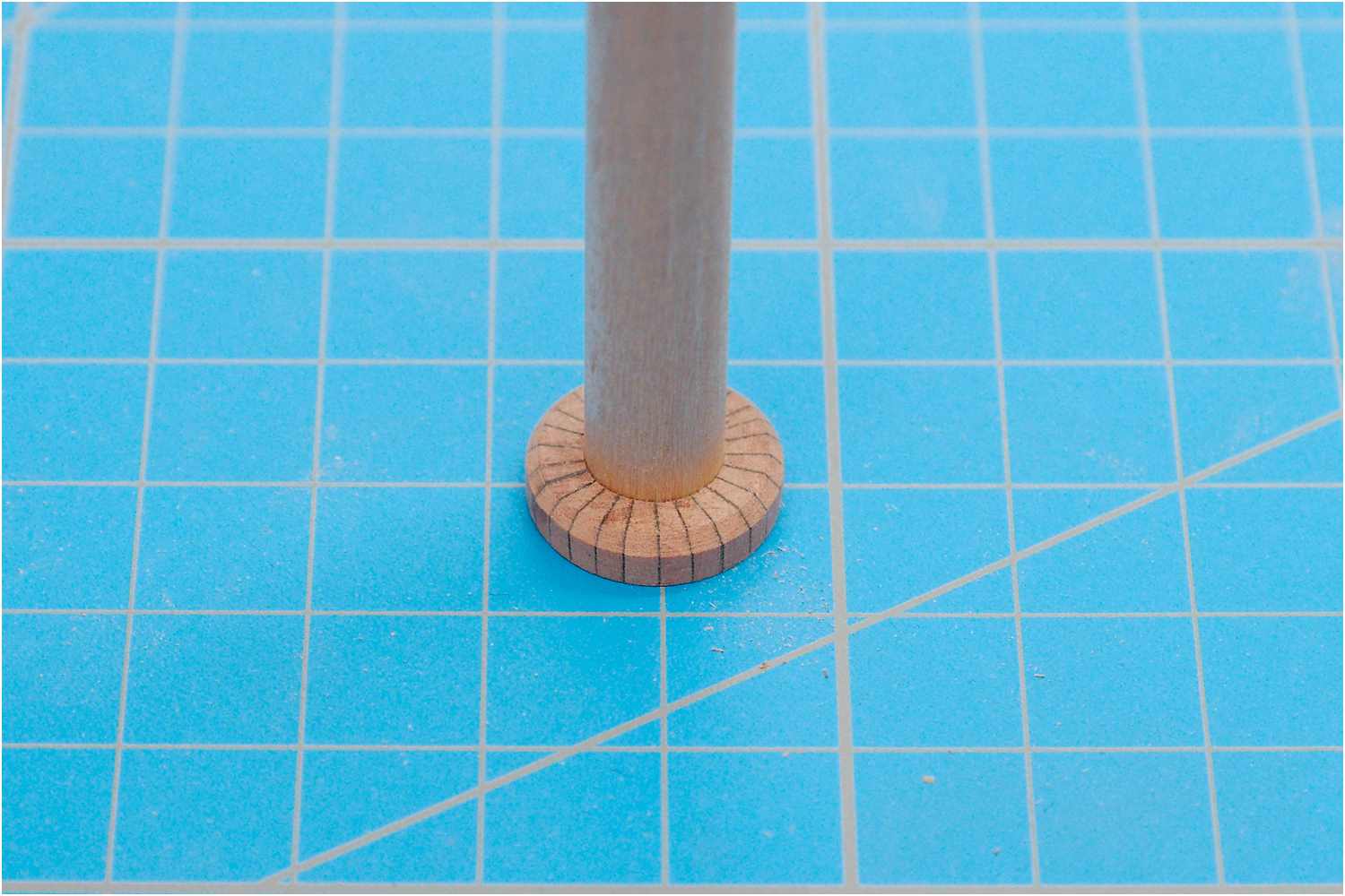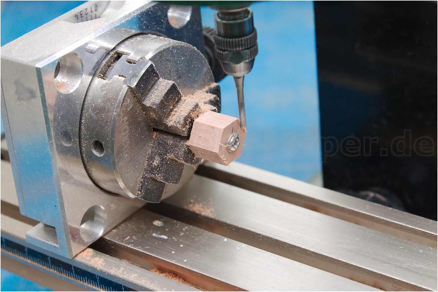 Die Stenge wird ebenfalls gedrechselt und erhält auch eine Abschrägung, aber quasi gespiegelt.