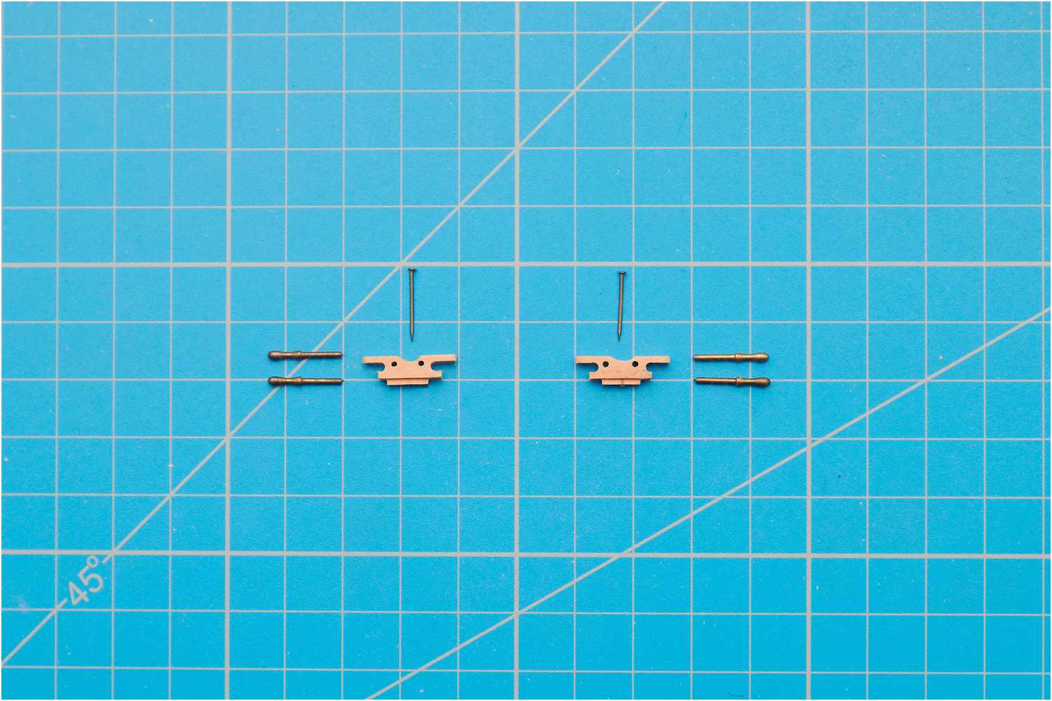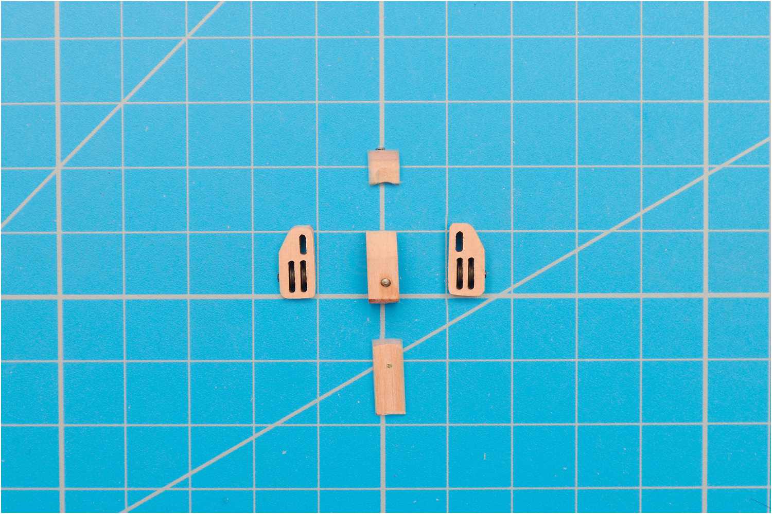 Die Mastklampen sind fertig, mit Belegnägeln versehen und werden wieder in einer Vertiefung verklebt.