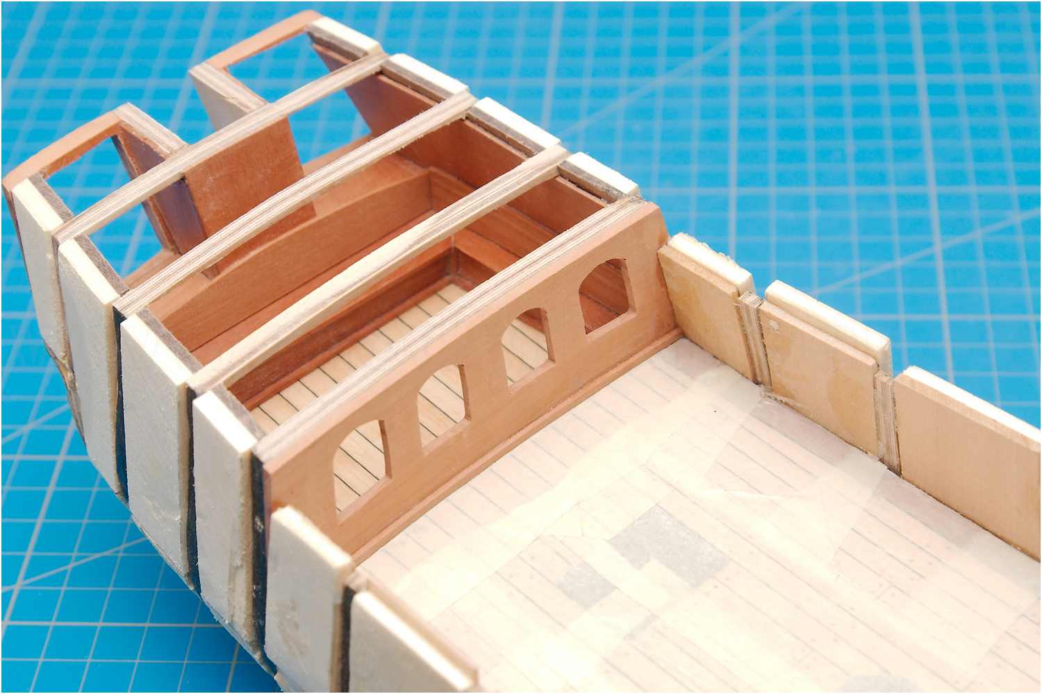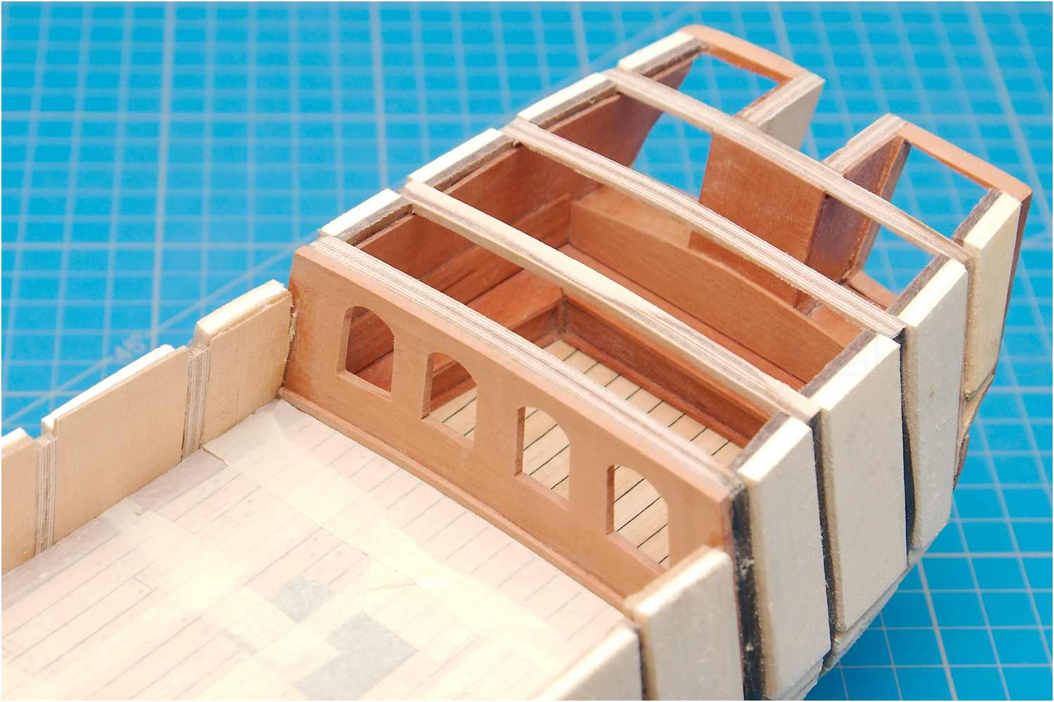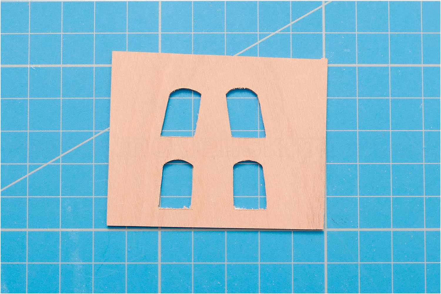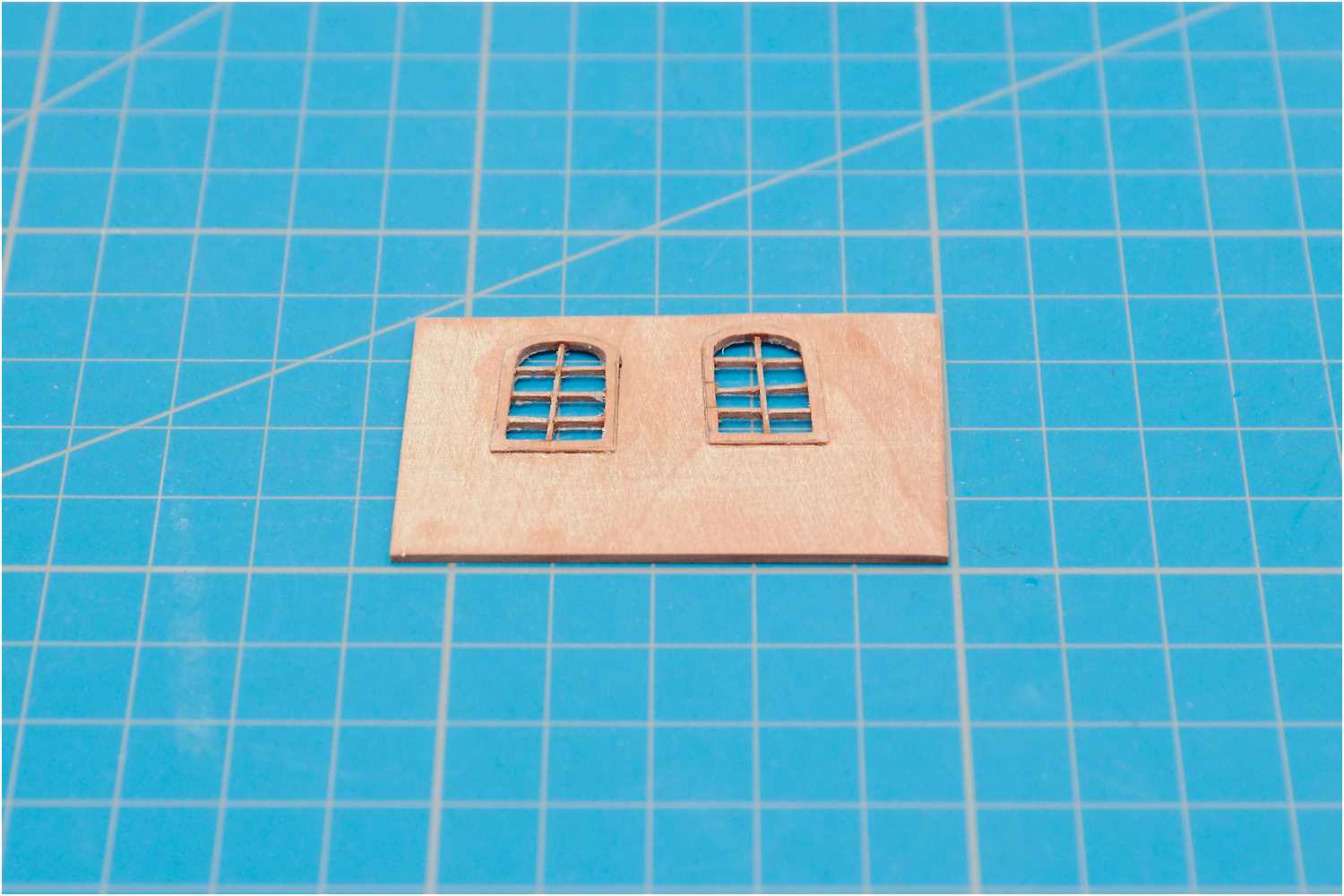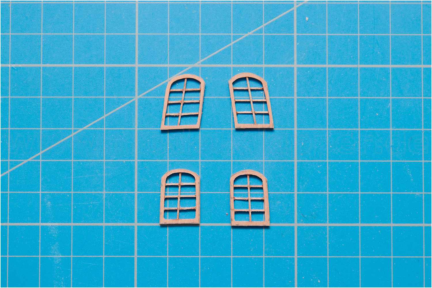 Die Fenster am Tellerschleifer abgeschliffen, ein Brettchen für die Blenden der Fensteröffnungen mit der Juweliersäge ausgesägt und die Rahmen so eingepasst, dass sie nicht ganz bündig abschließen und leicht nach außen zeigen.