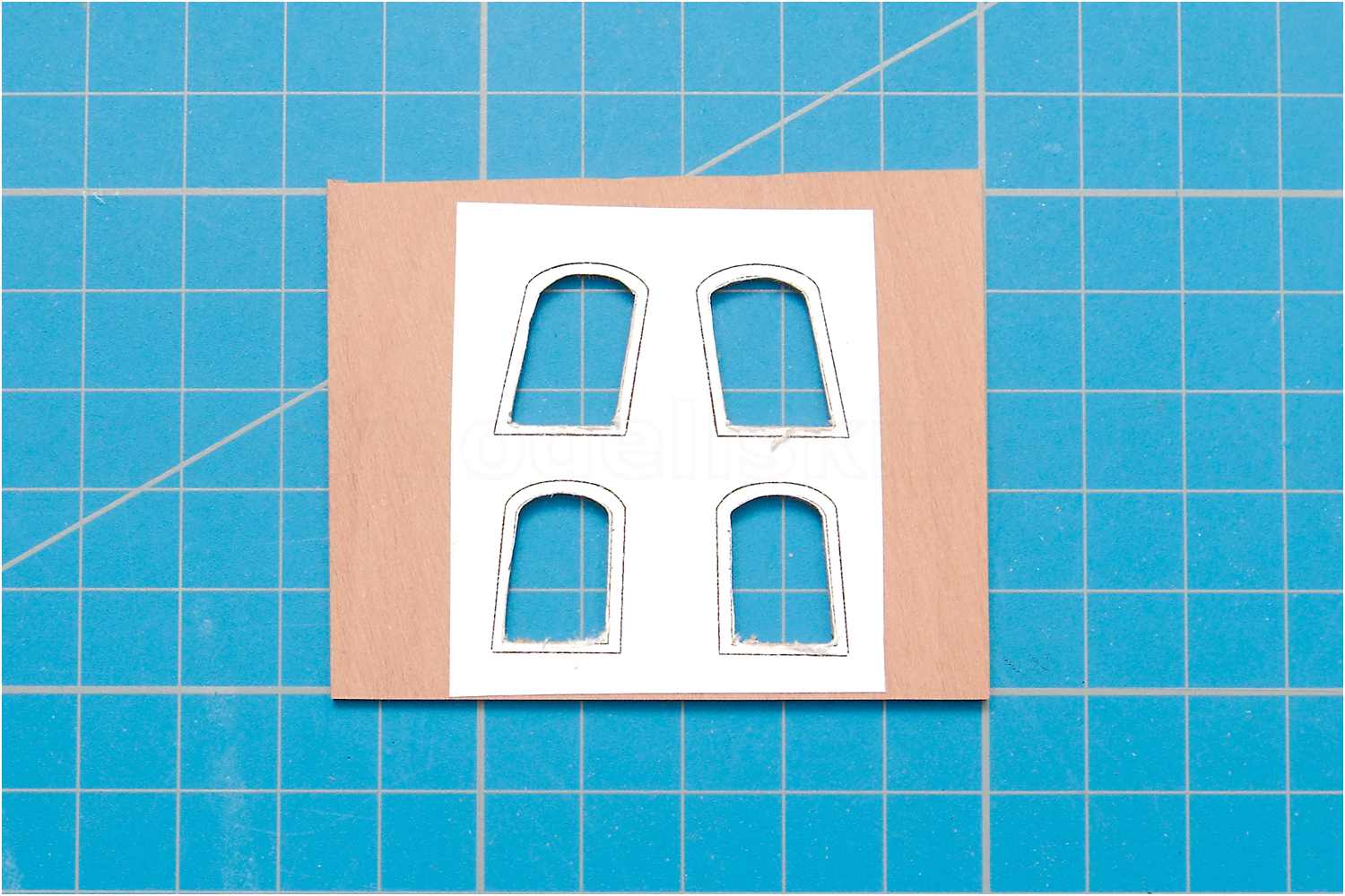 Eine Schablone der Fensterrahmen am Schott habe ich auf ein Brettchen geklebt und mit der Juweliersäge ausgesägt.