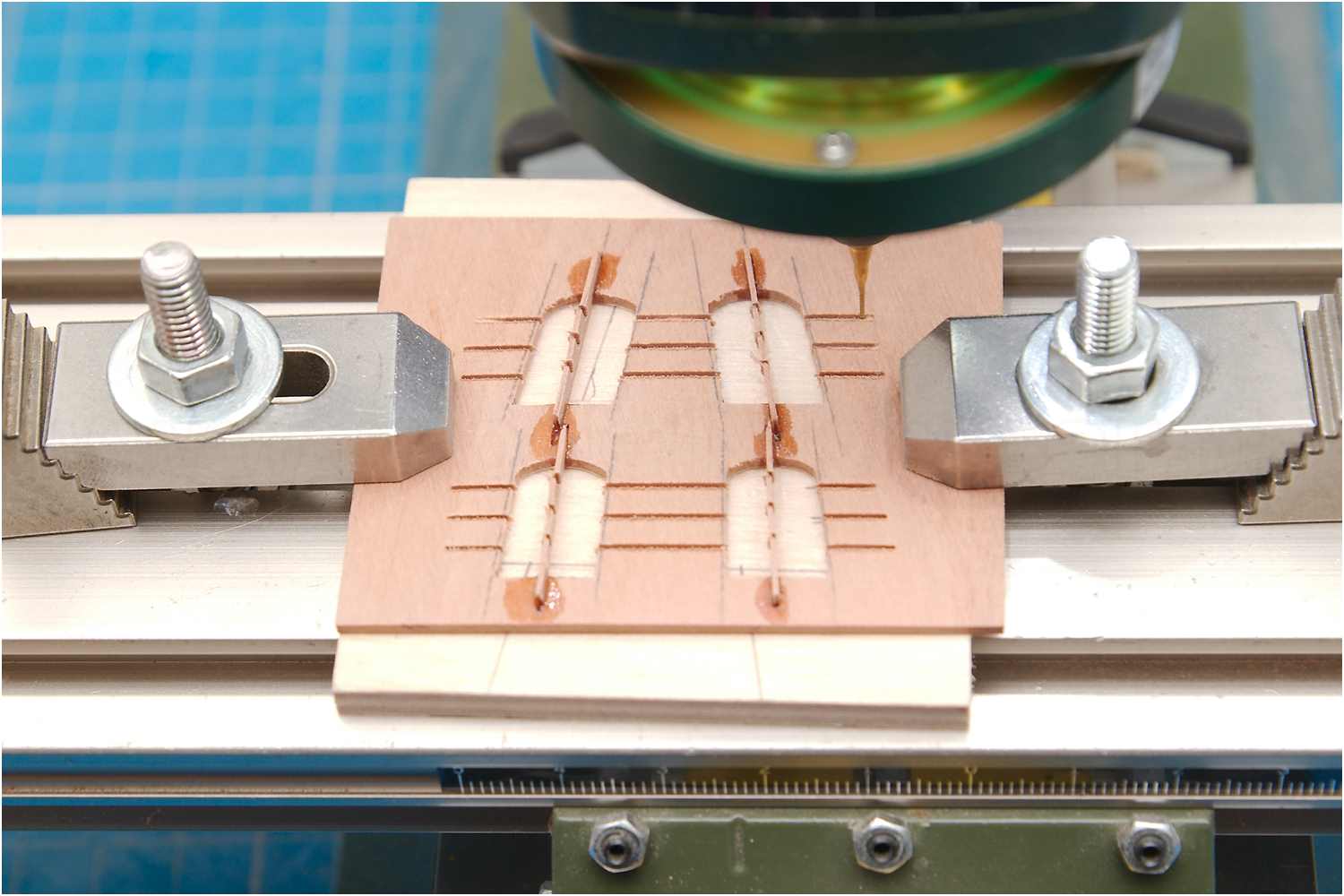 Für das Fensterkreuz wurde zuerst eine Nut für die senkrechte Sprosse mit einem 0,6 mm Fräser gefräst und eine Furnierleiste eingeklebt, dann die Nuten der waagerechten Sprossen und in diese einen Steckschlitz eingearbeitet. Das komplette Fensterkreuz wurde zusammengesetzt und verleimt.