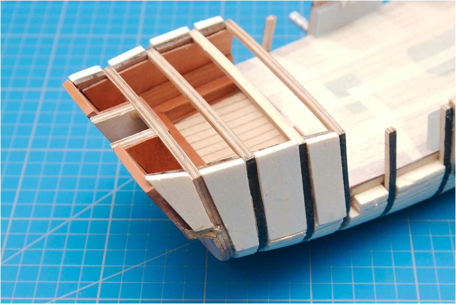 Rumpf komplett geschliffen, Stückpforten eingesetzt und Erkerfenster ausgearbeitet