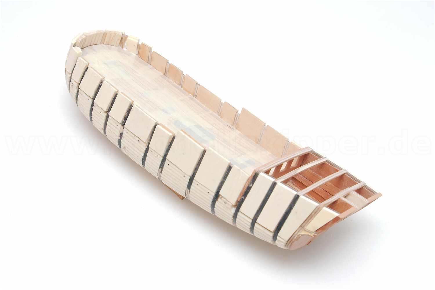 Das für die Verfüllung verwendete Pappelsperrholz ist ein leichtes/weiches Holz. Es ist stabiler als Balsa und die Stoßnadeln für die spätere Beplankung halten sehr gut.
