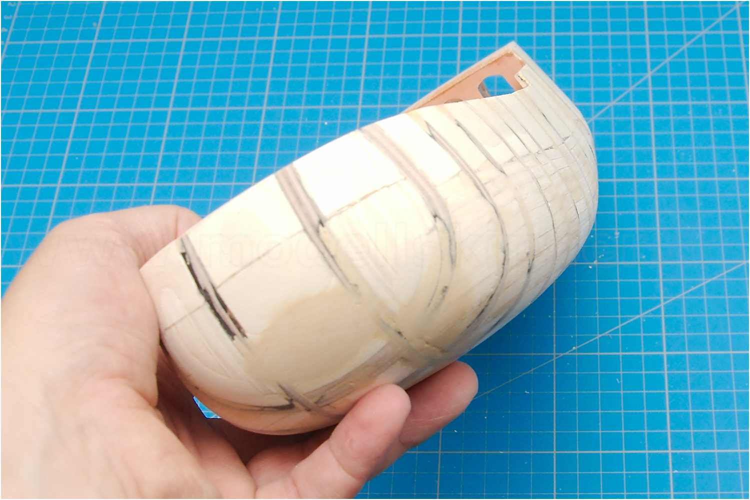 Während sich die nach außen gebogenen Rundungen in der Rumpfmitte und am Bug recht einfach bearbeiten lassen, nutze ich für die konkaven Formen im Heckbereich ein gewölbtes Schleifbrettchen.