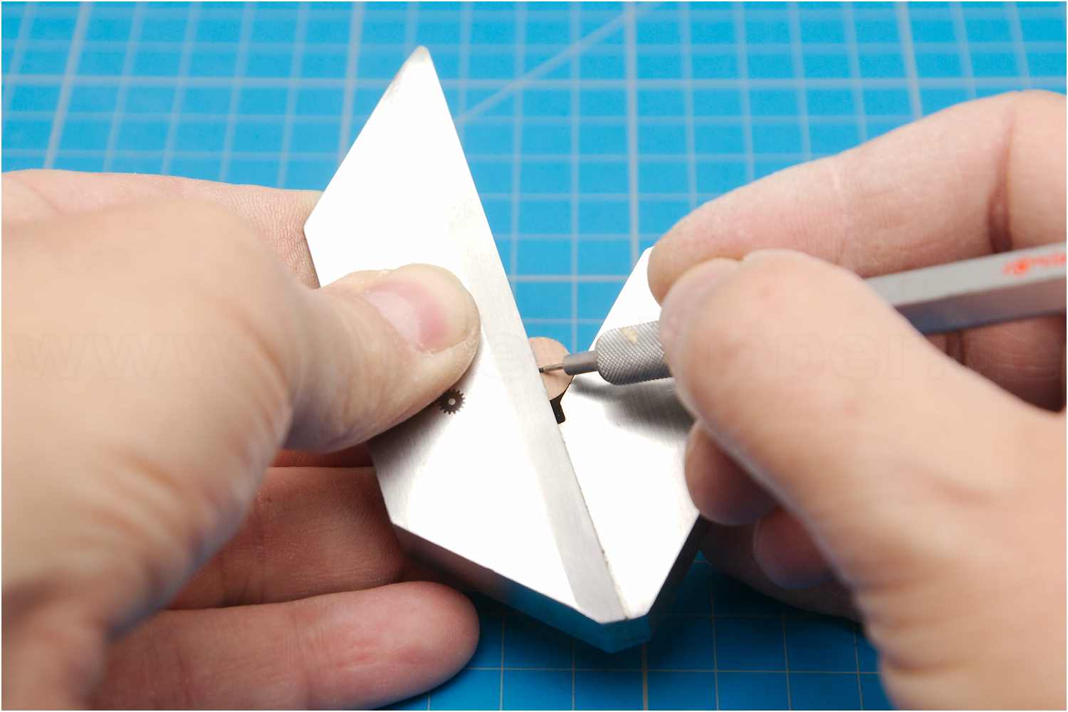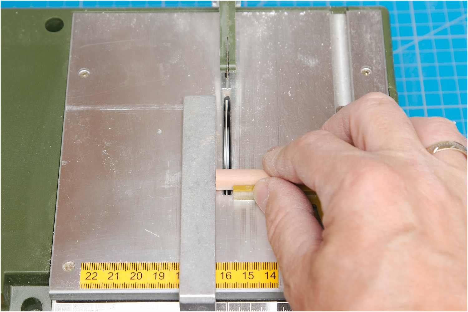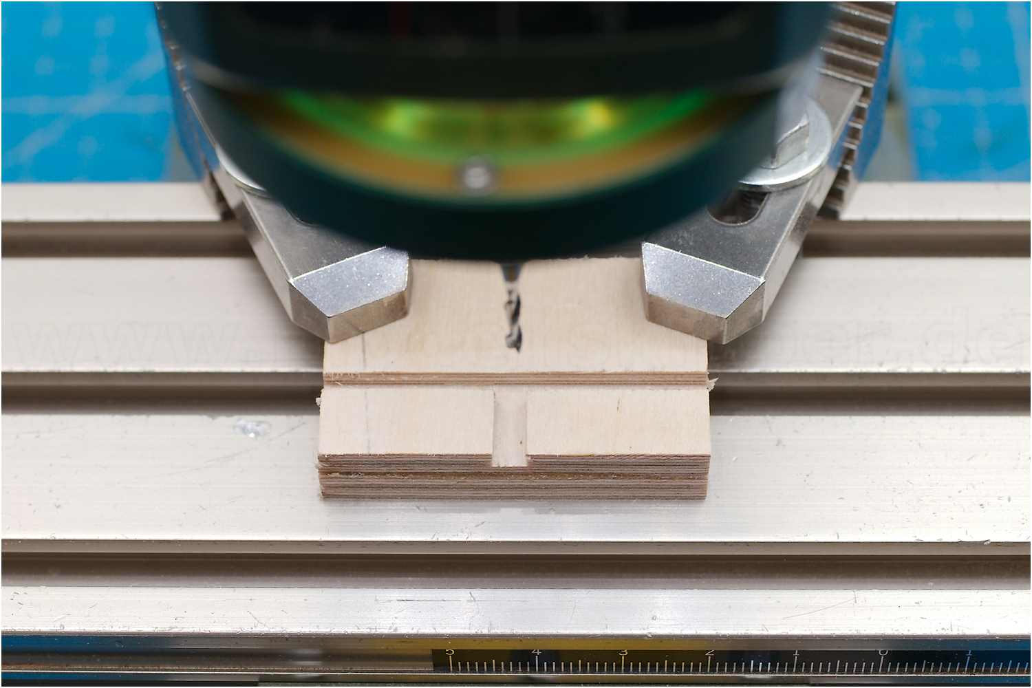 Um ein Ausbrechen des Werkstücks nach oben zu vermeiden, habe ich über die Führung zwei Anschläge geklebt.