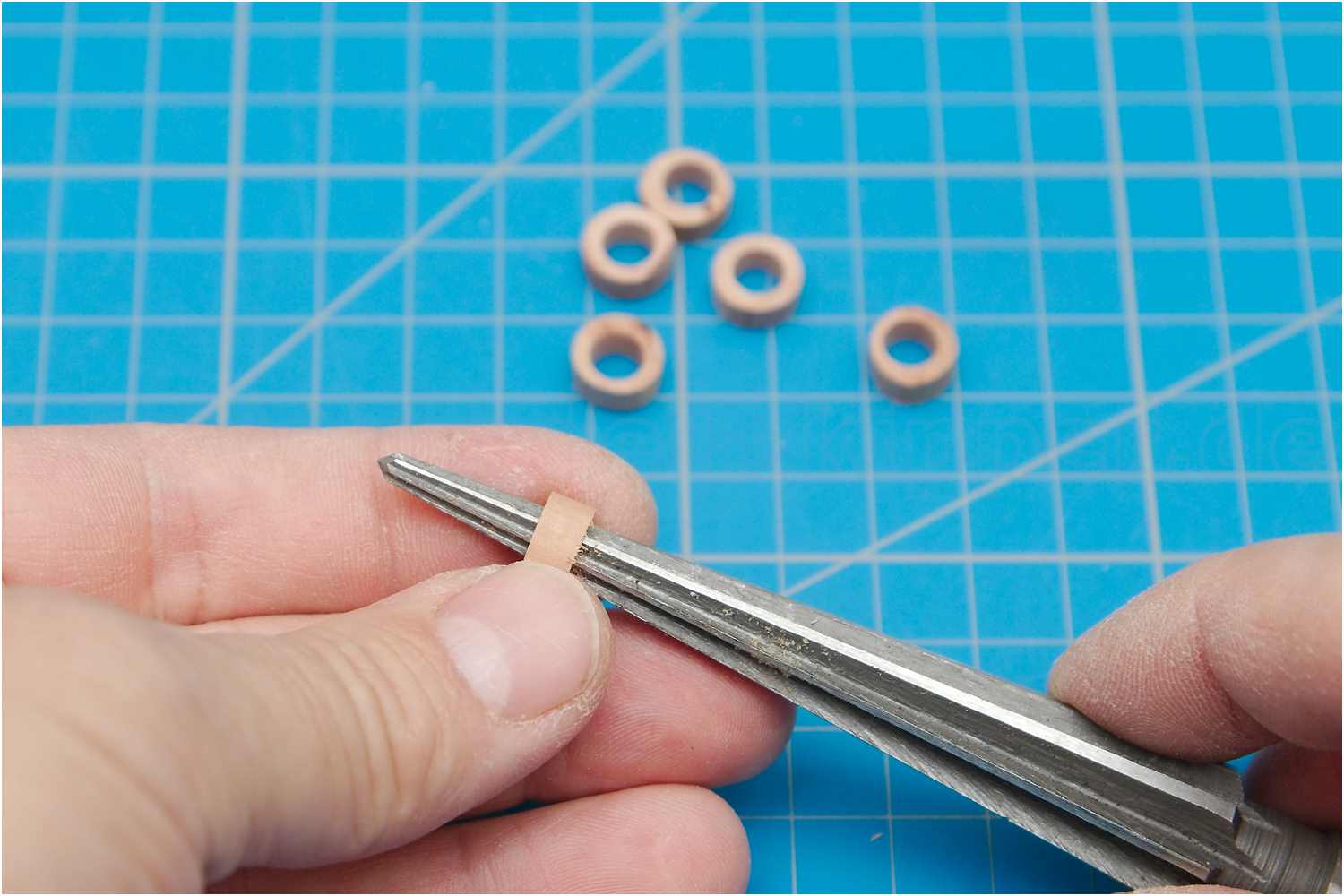 Dazu habe ich bei einem Stück Rundholz mit dem Zentrierwinkel den Mittelpunkt markiert, aufgebohrt, Scheiben abgeschnitten und mit einer Reibahle entgratet.