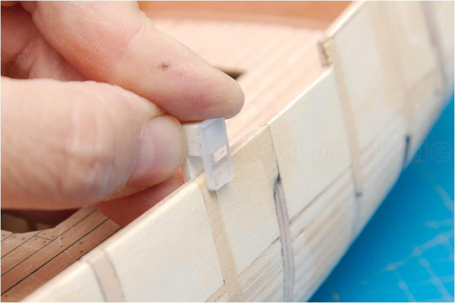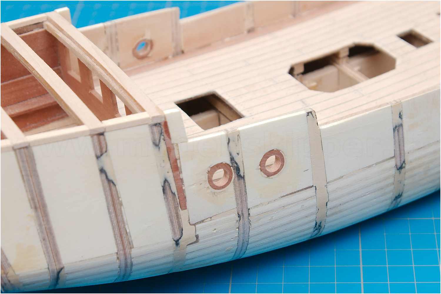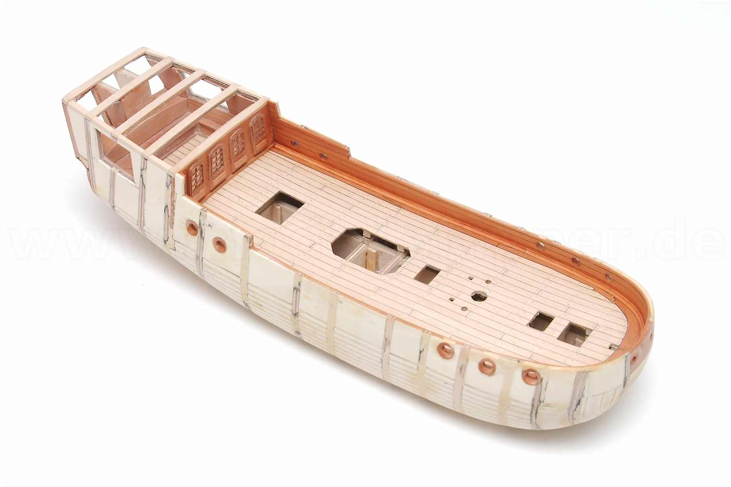 Der Stoß der Leisten am Schott, der "kalfaterte" Plankengang und der Schandeckel sind gut gelungen.