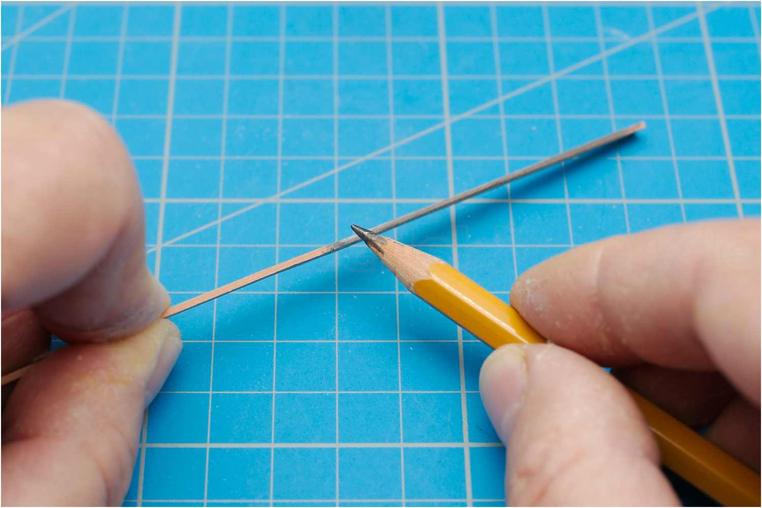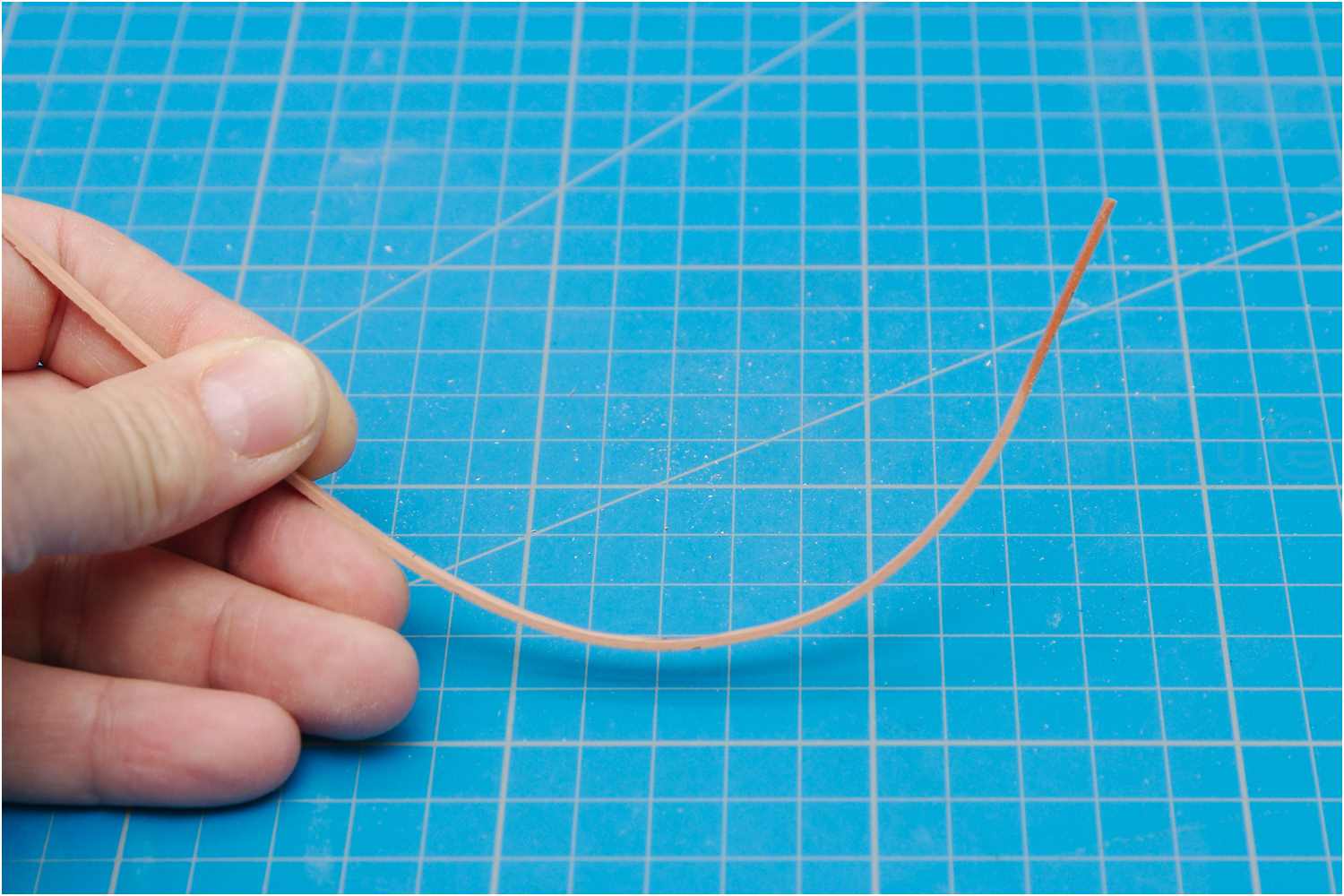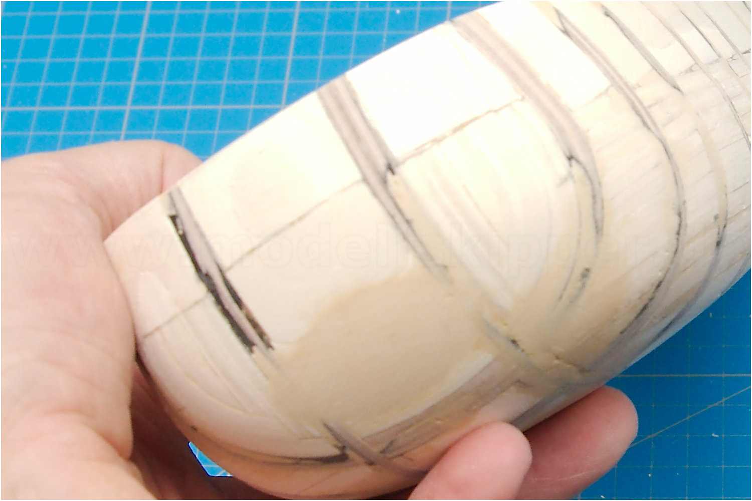 Zum Einpassen wird die Planke noch für den vorderen Bereich des Schanzkleides vorgebogen und die Seitenkanten mit einem Bleistift geschwärzt, um eine Trennung für den Lauf der Planken zu "visualisieren".