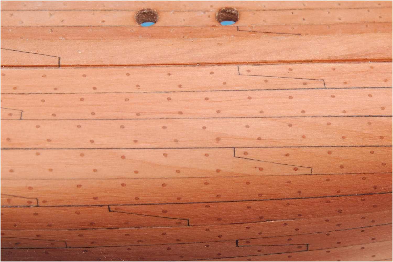 Nach dem kompletten Schliff und Lackierung des Rumpfes, wurden die Berghölzer und Plankenenden, in Anlehnung an die Statenjacht Utrecht und im Unterschied zu den sonst gedübelten Planken, mit Messingbolzen versehen.