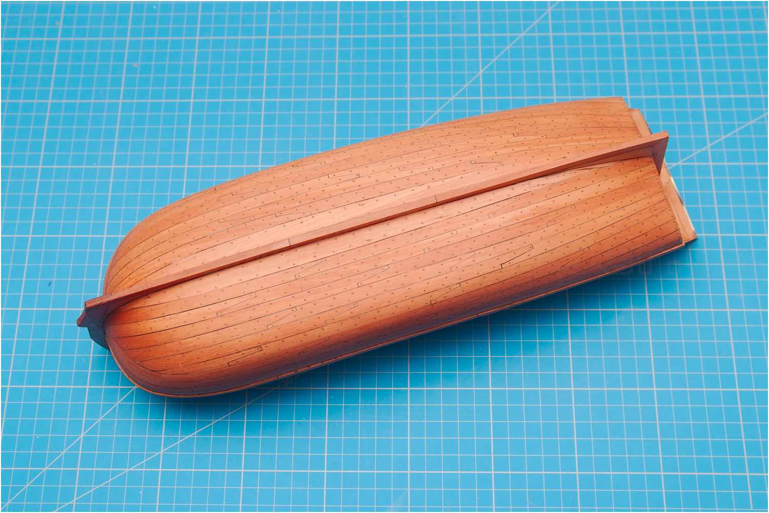 Nach 329 Baustunden ist der Rumpf komplett beplankt, es wurden 1.600 Dübel verarbeitet.