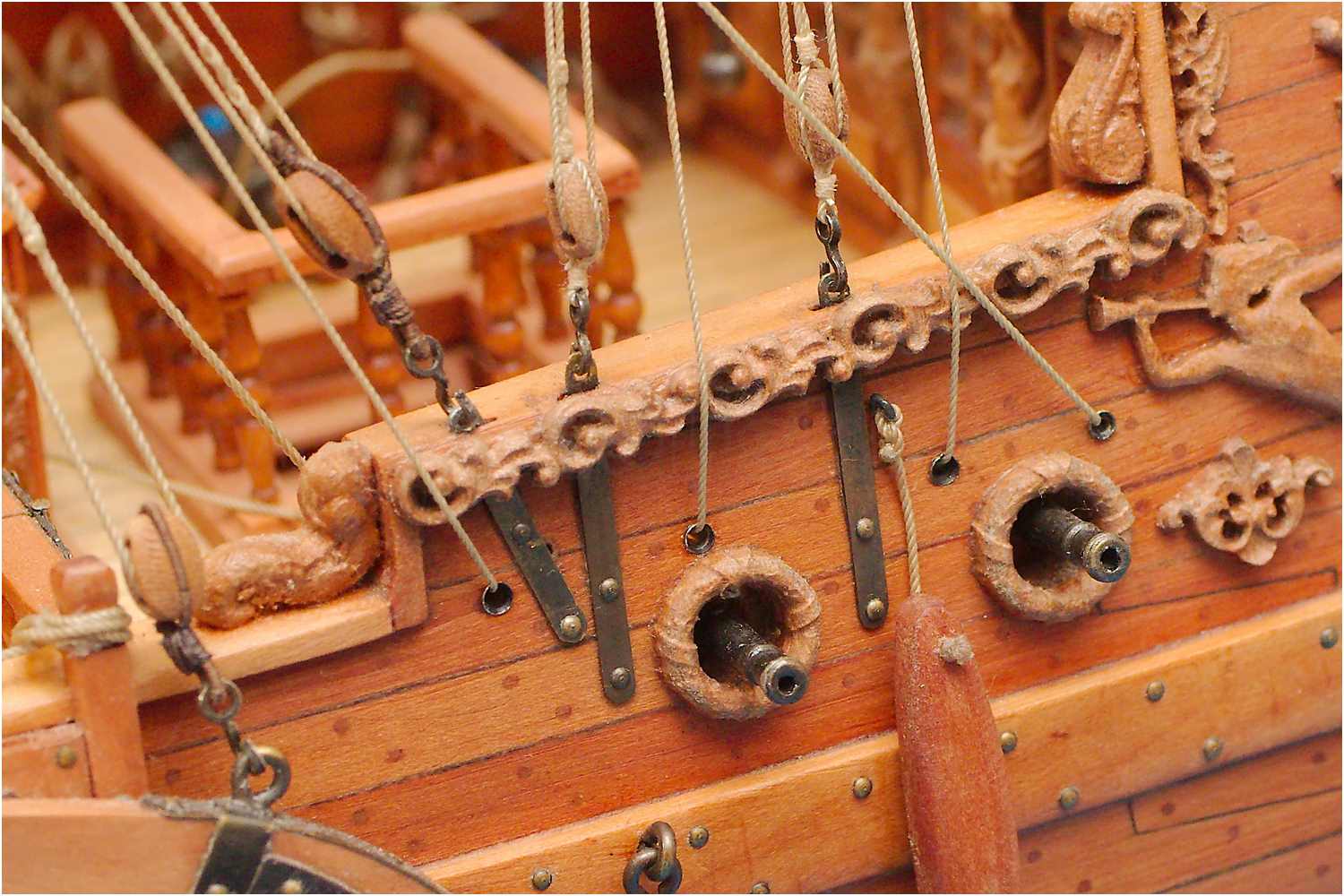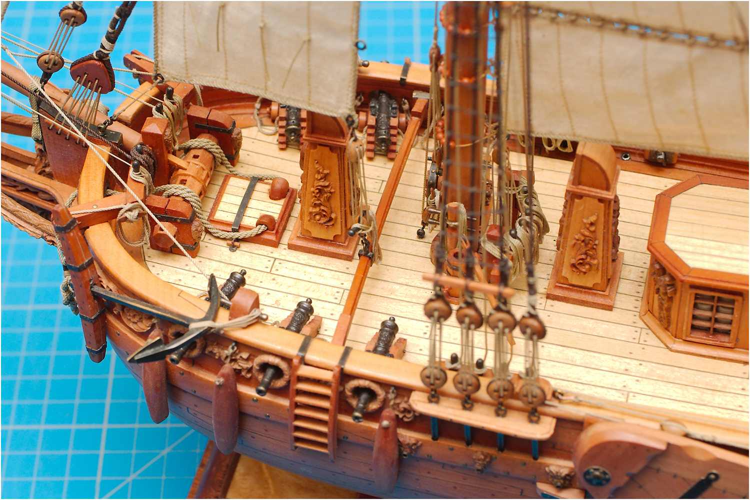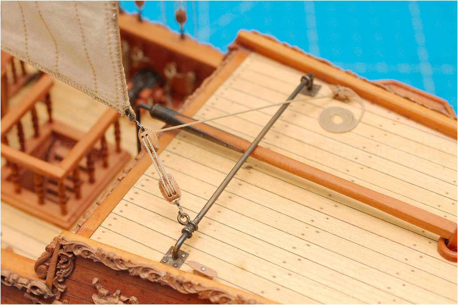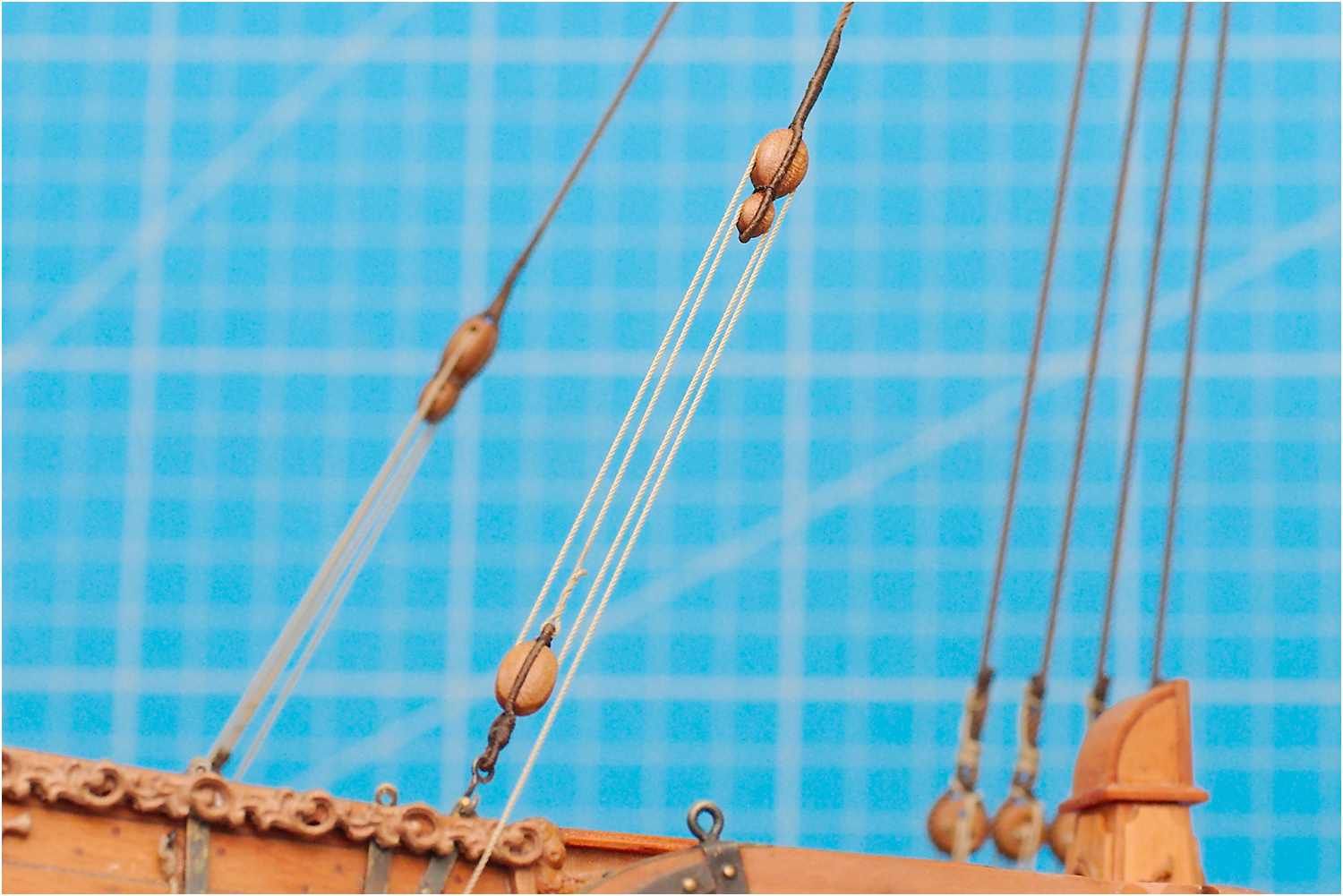 Q: 194, korrigiert nach JU 2 x Violine (7 mm), 2 x E-Block (5 mm) Doppelschenkel zusammen mit [11], eingehakt am Gaffelnockbeschlag, Verhältnis Schenkel zum Läufer 3:1, unterer Block der Taljen eingehakt in den Püttings am Setzbord, laufende Part läuft durch ein Loch im Schanzkleid siehe NJ 195 (225) belegt links und rechts an der dritten Klampe Innenseite Setzbord, hinter den Backstagen [7] Garn: Schenkel 3x6 Skala 200, Läufer 3x2 Skala 200 |